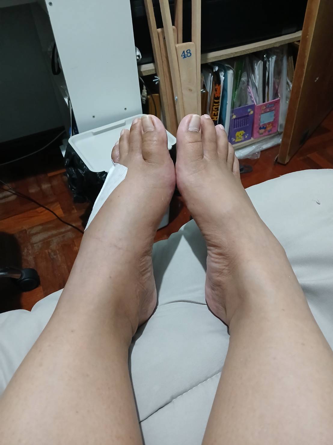 ตอนนี้ใช้ไม้ค้ำพยุง เท้าที่เจ็บยังลงน้ำหนักทั้งหมดไม่ได้ มีบวมๆหลังเท้าอยู่ เวลาเดินใช้ส่วนส้นเท้าลงพอพยุงได้ แต่ต้องใช้ไม้ค้ำ