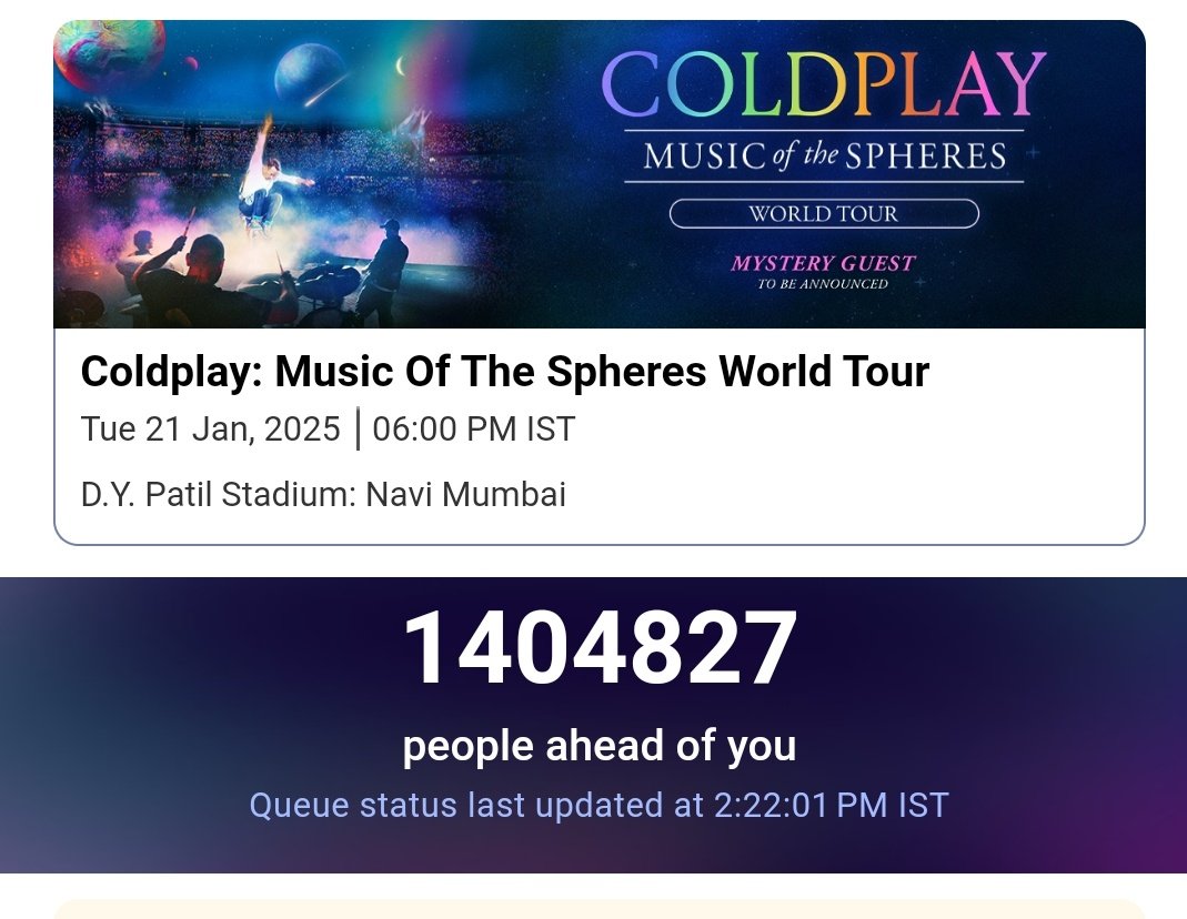 ล่าสุดวง Coldplay เปิดให้จองตั๋วสำหรับคอนเสิร์ต "Music of the Spheres" ในอินเดีย สำหรับการแสดง 2 วัน ปรากฏว่ามียูสเซอร์ที่พยายามจะซื้อตั๋วจำนวน 13 ล้านคน 😮 จน Coldplay ต้องเพิ่มรอบเป็น 3 วัน