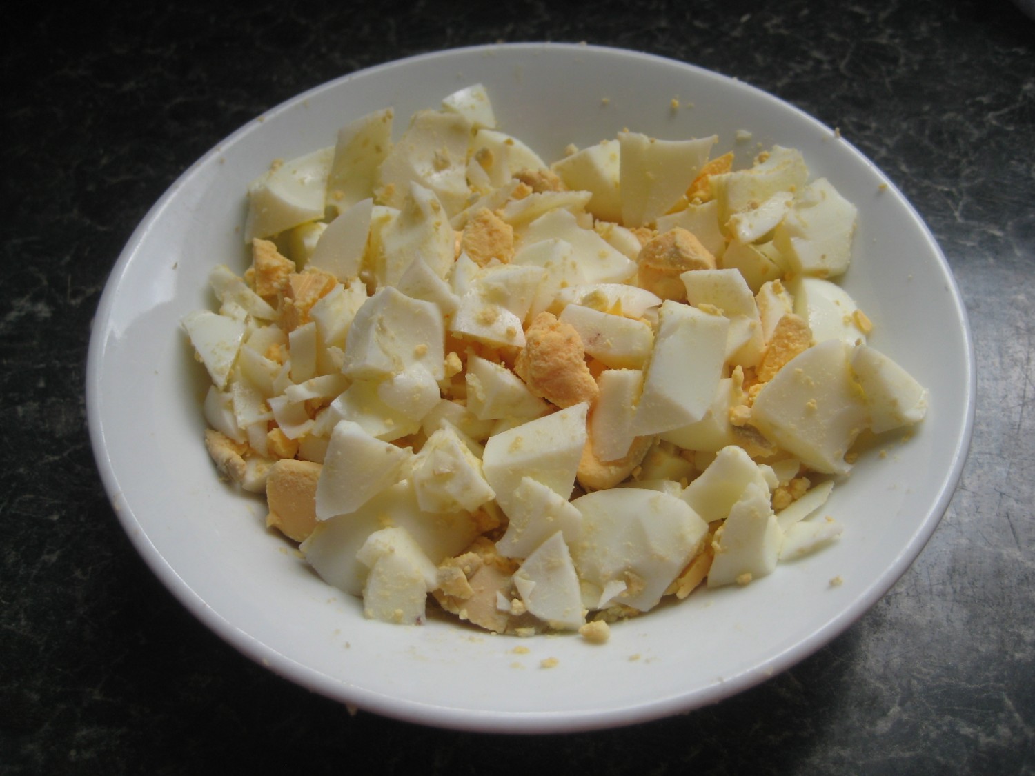 วิธีทำ ตั้งหม้อน้ำต้มไข่บนเตาใช้ไฟแรงต้มประมาณ 8-10 นาทีหรือจนกว่าไข่จะสุก นำไข่ไปปลอกเปลือกหั่นเป็นชิ้น ๆ พักไว้