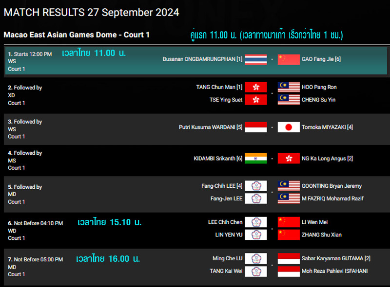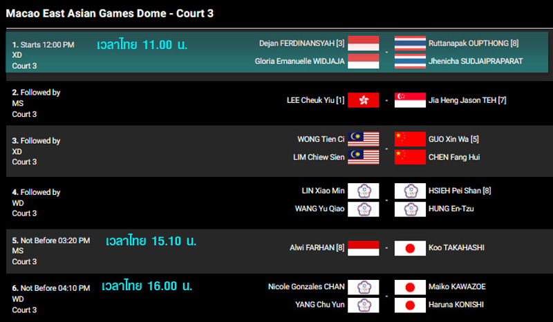 • ถ่ายทอดสดทาง Youtube BWF TV (คู่แรก 11.00 น.)
