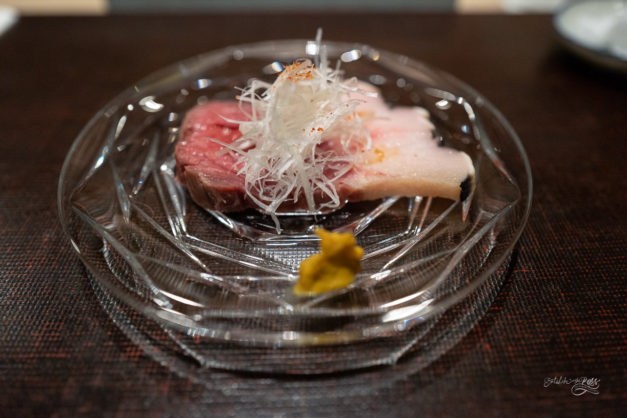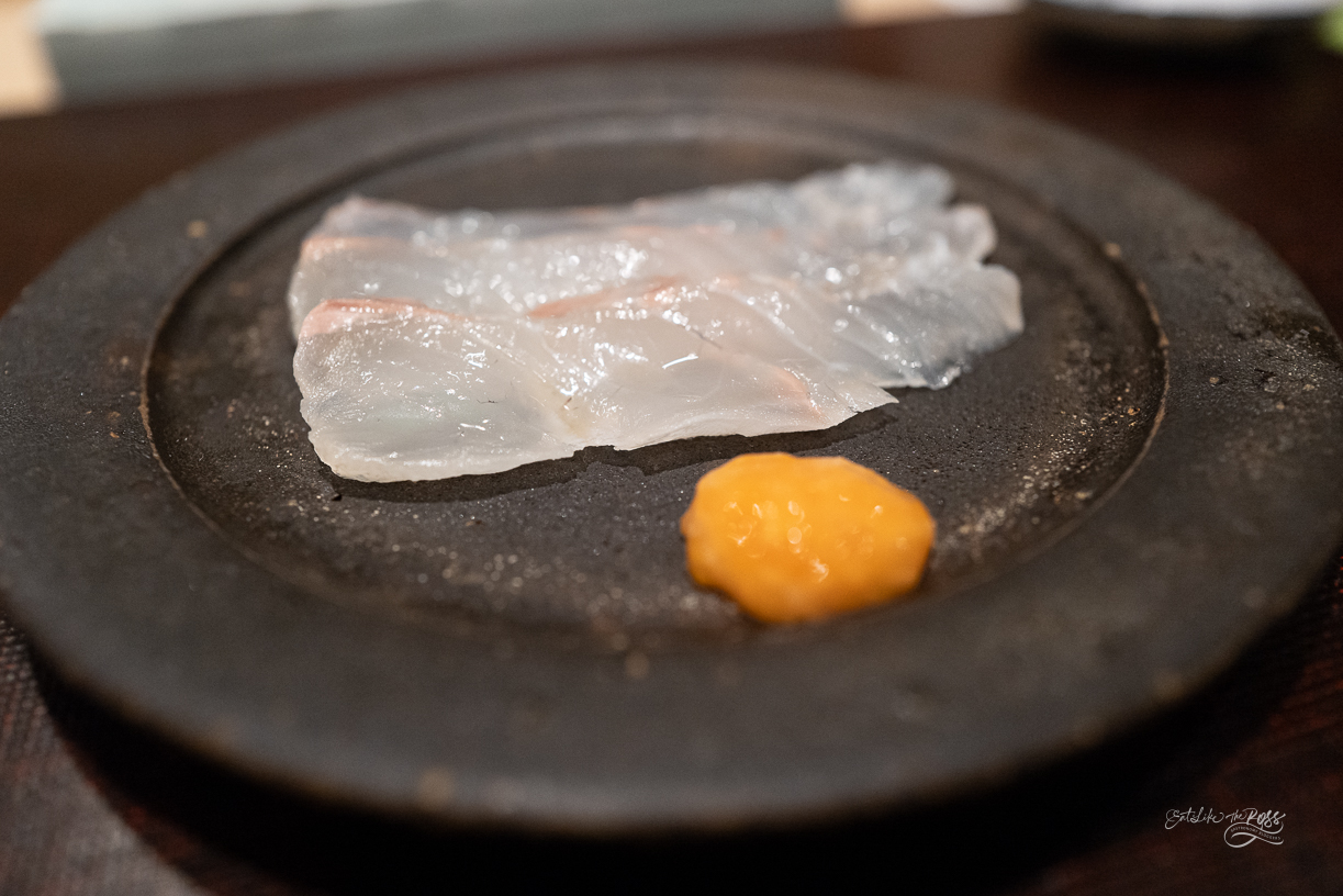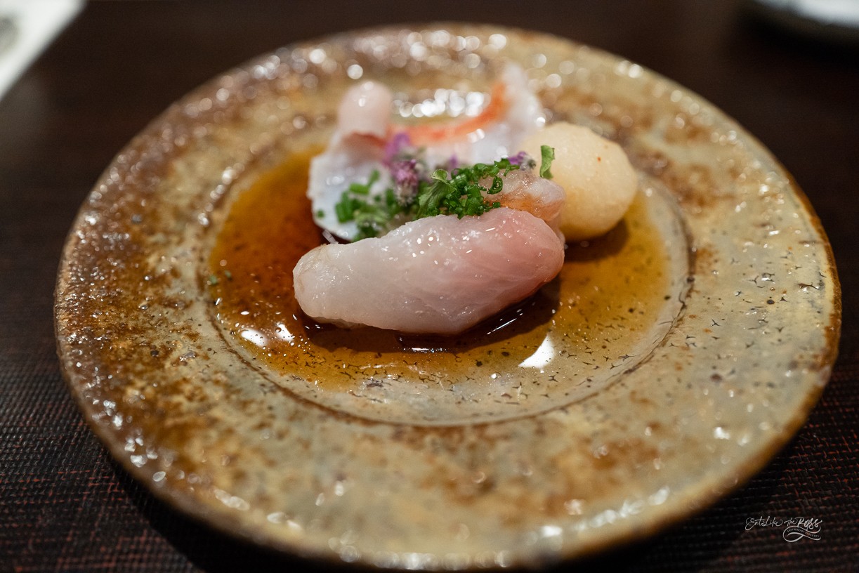 หรือจะเป็นซาชิมิHirame kombujime รับประทานกับซอสจากปลิงหนามดองเกลือหรือkonowata konoko นั้นก็เป็นอีกจานที่ทำออกมาได้น่าสนใจ จานนี้ปลาคุณภาพชั้น 1ครับปลาHirameชั้นดีเนื้อหนึบกรอบ ผมแนะนำให้รับประทานกับโชยุก่อน ที่นี่นั้นมีโชยุอยู่ 2 ชนิดในการใช้ซึ่งในจานนี้เชฟใช้โชว์อยู่ค่อนข้างอ่อนผมว่ามันขับรสหวานของปลาเนื้อขาวได้ดีเลยครับ ส่วนซอสปลิงหนามดองเกลือ มีรสที่เข้มข้นกว่าเค็ม และติดปลายเผ็ดนิดๆคล้ายกับชิโอะคาระ