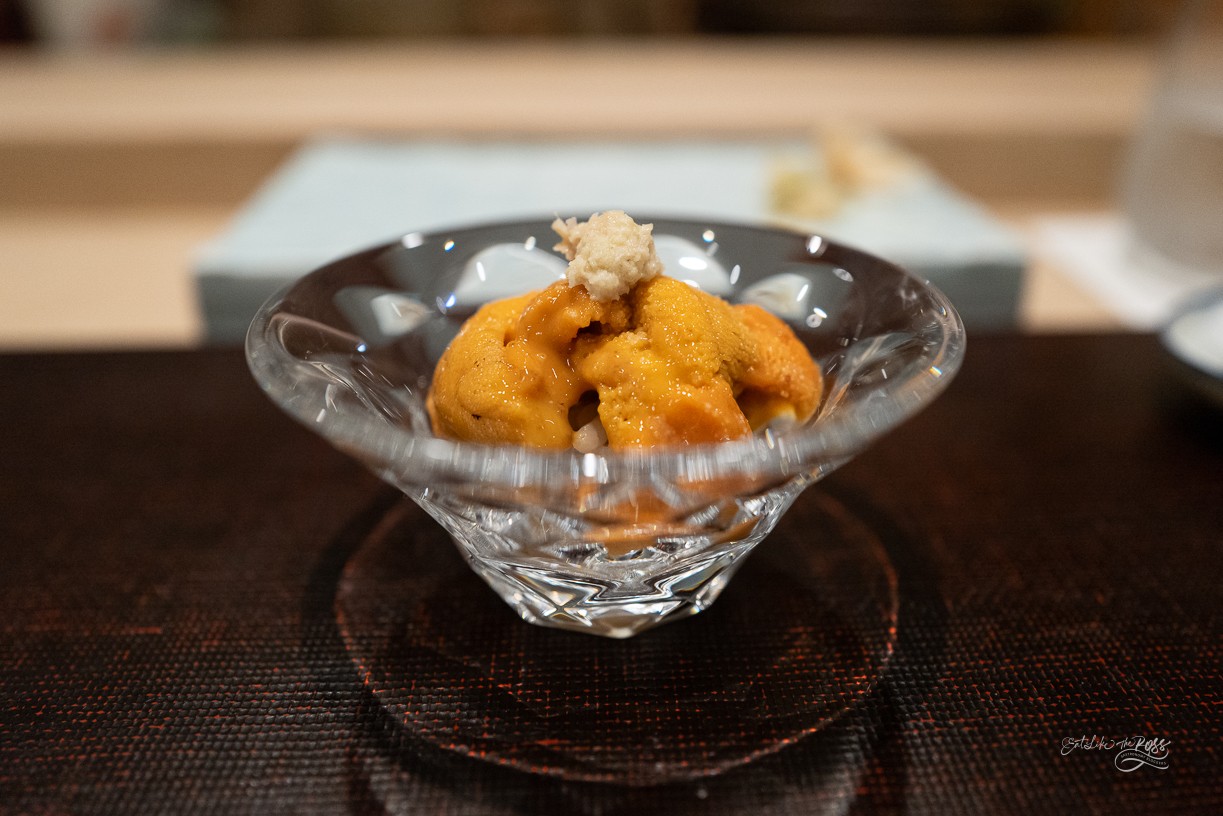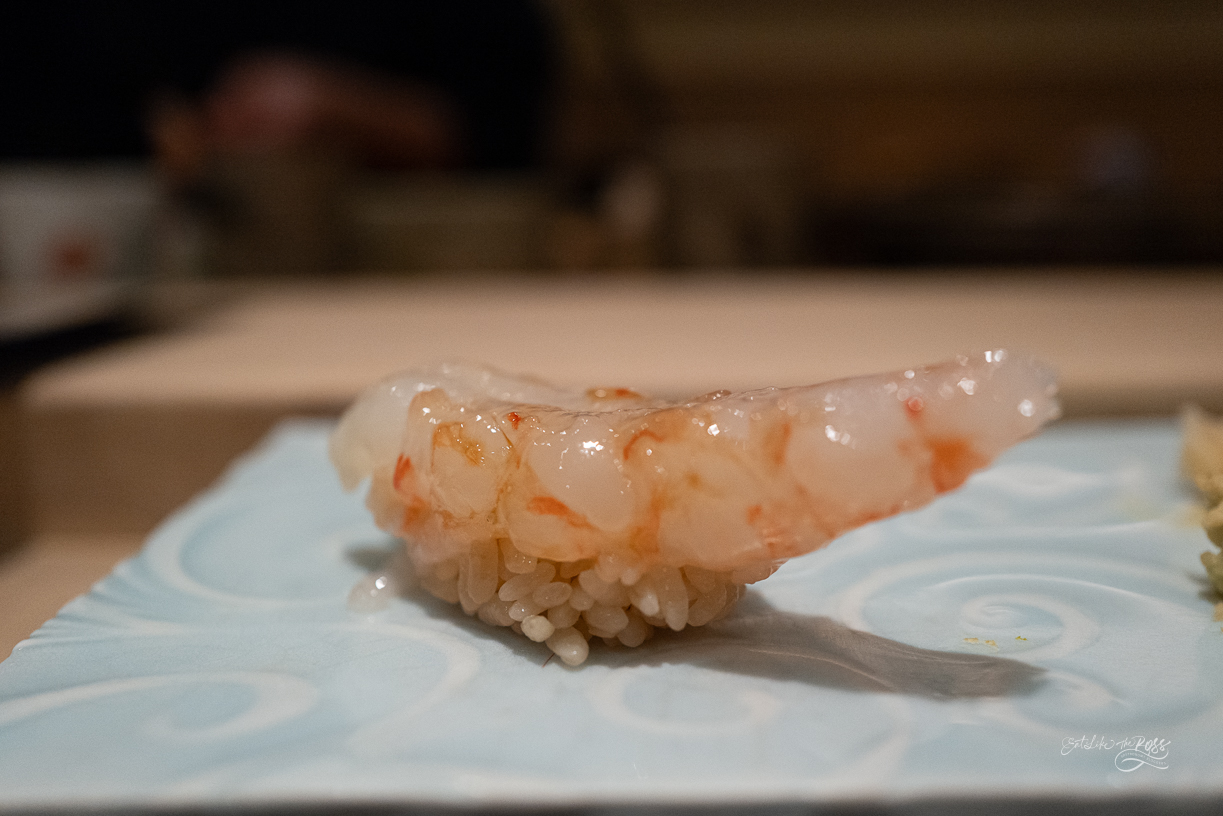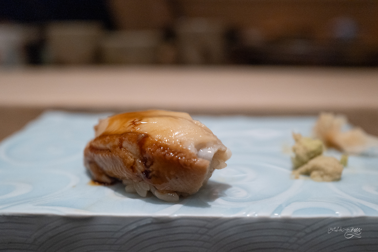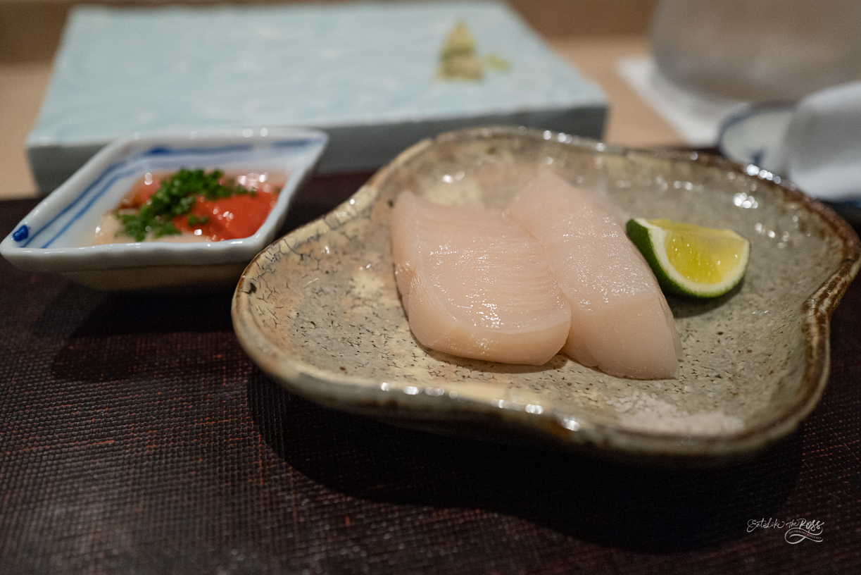 Hokkigai คำต่อมาเป็นหอยปีกนก จานนี้เนื้อหอยมีคุณภาพดีครับ โดยเชฟบั้งมันนิดๆทำให้เนื้อมีความนุ่มขึ้นแต่ยังคงความกรอบและไม่เหนียว เกลือและมะนาวที่ปรุงรสมาในคำนี้นั้นช่วยชูรสหวานของหอยได้อย่างยอดเยี่ยม เป็นหนึ่งในคำที่อร่อยมากครับ