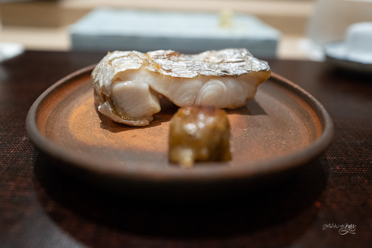 คำต่อมาเป็นปลากิงกิโดยก่อนเสริฟ์เชฟนำไปอาบุรินิดนึงก่อนนำมาเสริฟ์ครับ ผมสังเกตหลายจานแล้วรวมถึงคำนี้คือพวกการย่างของที่นี้นั้นจะมีกลิ่นหอมจากการย่างแต่ไม่มีกลิ่นควัน คำนี้ปลาเนื้อกรอบแต่ไม่เเข็ง มันอ่อนๆนุ่ม พอรับประทานกับต้นหอมแล้วเข้ากันดีมากครับ