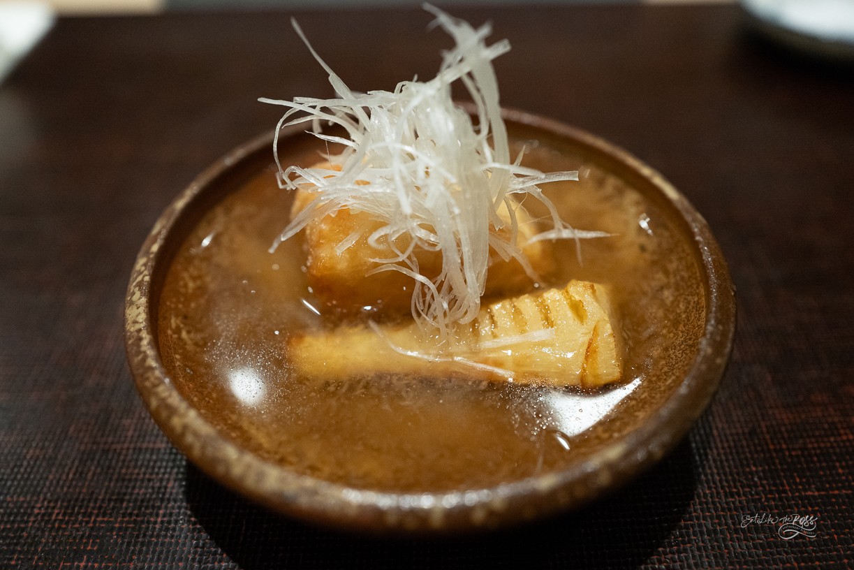 Tako Yawarakani จานนี้ของที่นี่นั้นมี Texture เป็นเอกลักษณ์ชัดเจนถ้าสังเกตจากรูปจะเห็น Texture เป็น 2 ส่วนคือผิวด้านนอกที่เป็นเยลลี่แต่ไม่เล็กกับแก่นต้องการที่กรอบแต่ไม่เหนียวลดซอสอ่อนๆเน้นรสเค็มจะโชยุเน้นชูความหวานของปลาหมึกยักษ์ เป็นอีกจานที่ทำได้ดีมากครับ