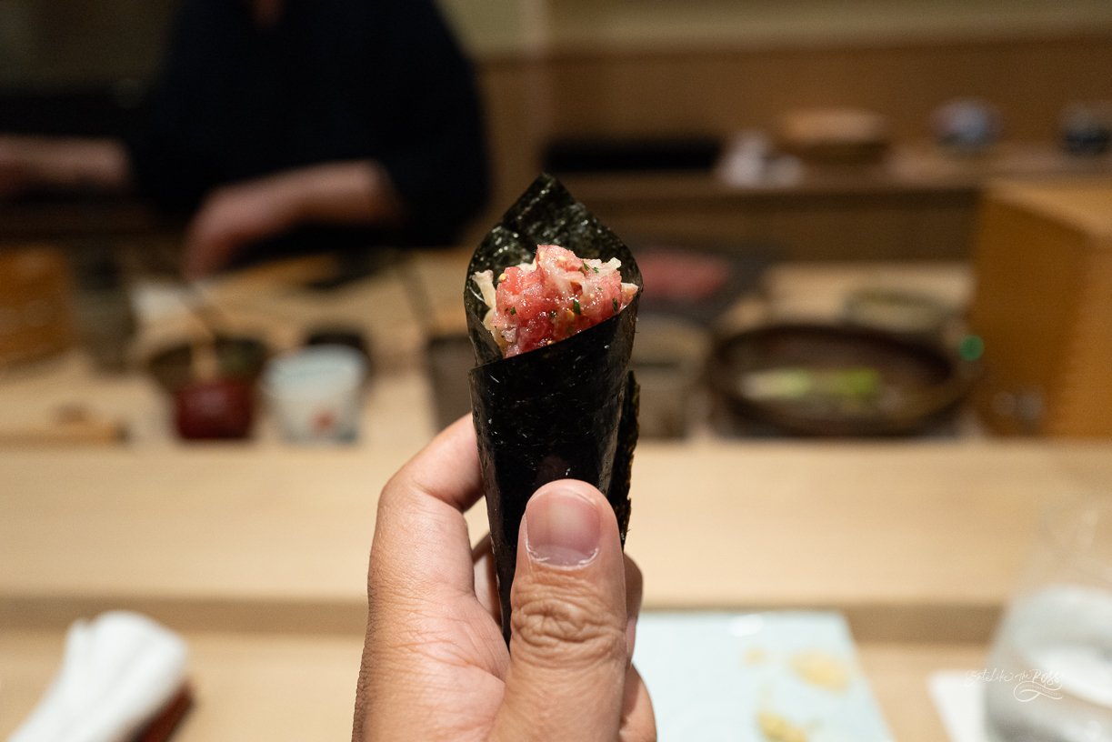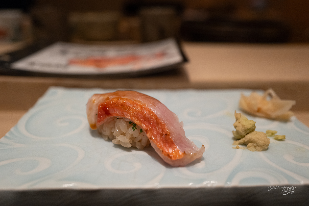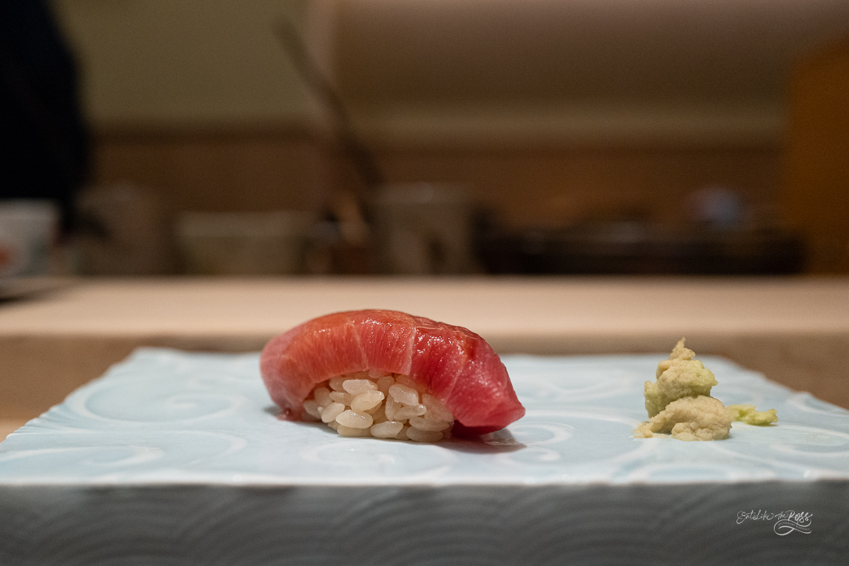 ชูโทโร่ คำนี้หั่นปลามาหนาพอสมควร ปลานั้นคุณภาพเหมาะสมกับราคาแต่เชฟบ่มไว้นานมากทำให้ปลามีความนุ่มและเข้มข้น คำนี้ปลาเนื้ออาจจะไม่มันมากแต่ก็ทำออกมาได้ดี ตัวข้าวของร้านนั้นใส่อากะชาริ ข้าวค่อนข้างปั้นยากเนื้อสัมผัสกรุบๆ แต่ค่อนข้างแฉะ ทำให้ในตอนต้นคอร์สอาจจะรู้สึกไม่ค่อย Enjoy ไปบ้างแต่ข้าวแบบนี้แหละในตอนปลายคอร์สจะอร่อยมากครับ