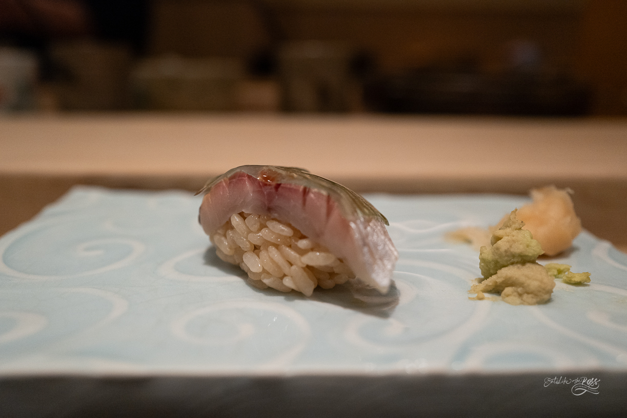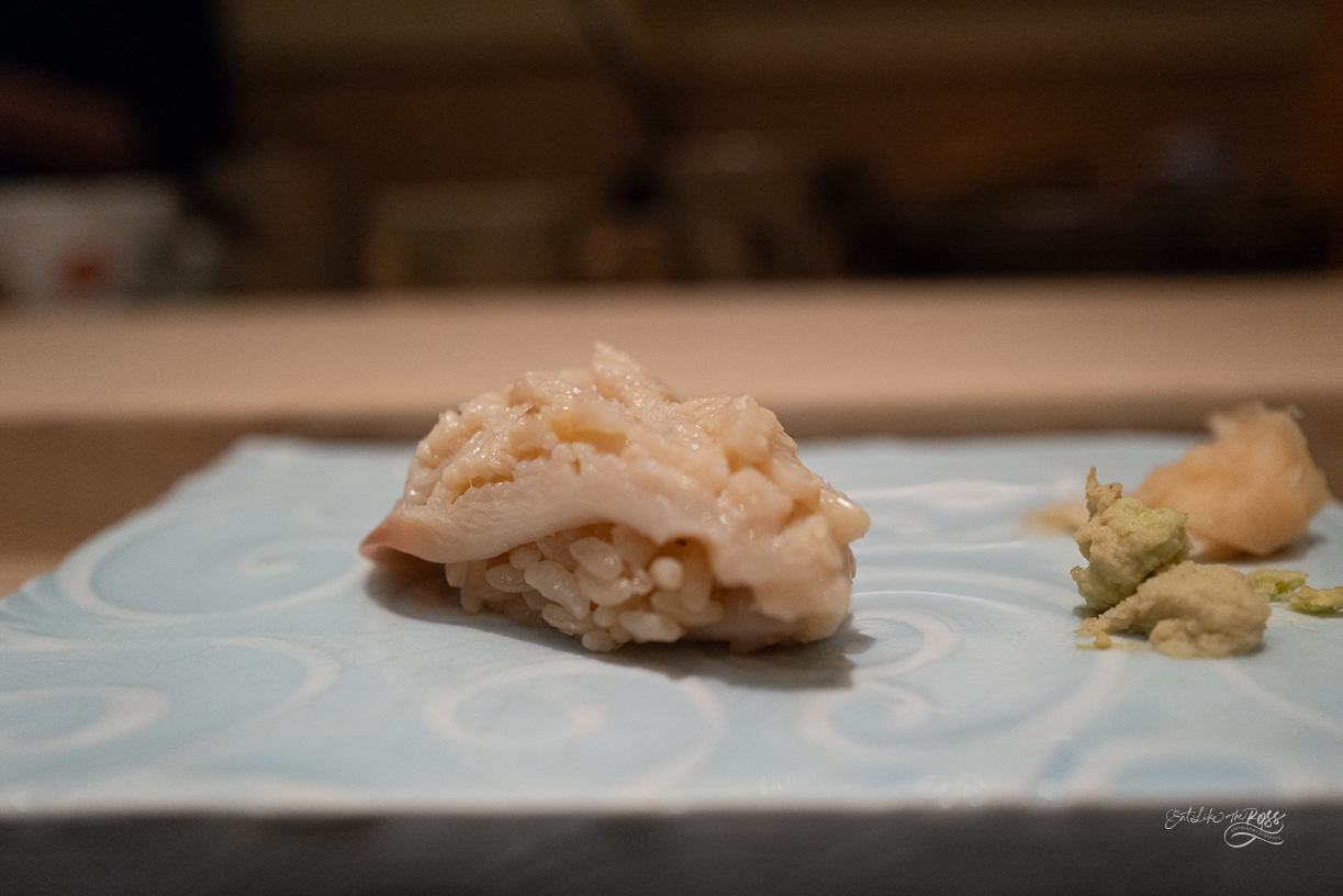 คำต่อมาเป็นหนึ่งในเอกลักษณ์ของซูชิEzo mae หรือซากุระมัทซึ โดยเชฟเสิร์ฟมันมาในแบบซึเกะ รับประทานกับ negi shoga จานนี้นั้นมีรถที่เข้มข้นปลาเนื้อนุ่มมากเหมือนกับเนย ซึ่งพอรับประทานกับข้าวที่ค่อนข้างแข็งแล้วสร้างความสนุกสนานในปากได้อย่างยอดเยี่ยม จานนี้เป็นจานที่รสจัดพอสมควรครับอาจจะจัดไปหรือเปล่าสำหรับต้นคอร์ส