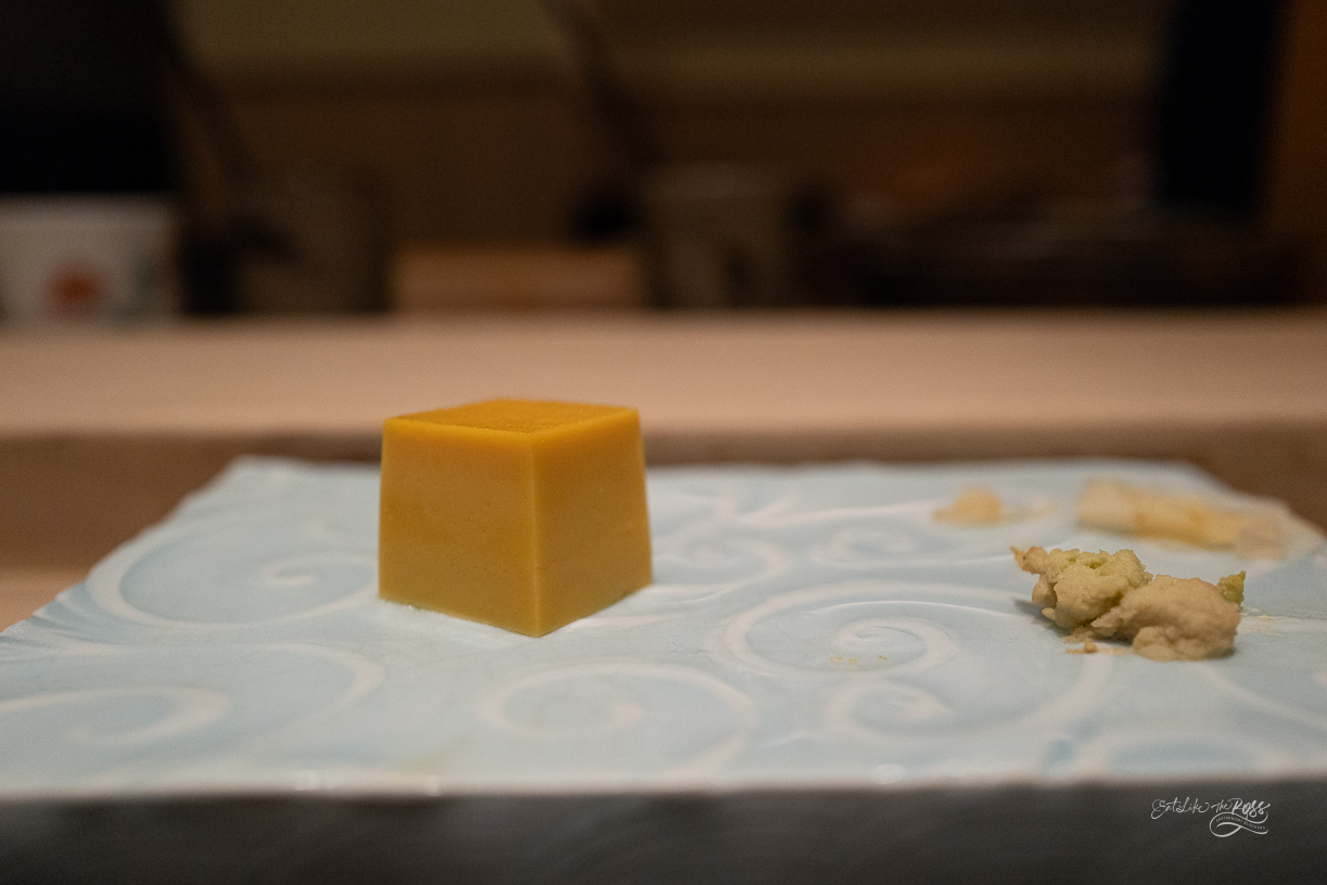 Hotate เชนเสิร์ฟมา2 รูปแบบ ในส่วนของซาซิมินั้นเสิร์ฟมากับเกลือจากเกาะอาวาจิและมะนาวครับ คำนี้เชฟบั้งที่ผิวเล็กน้อยทำให้เนื้อหอยเชลล์กรอบที่ผิวแต่นุ่มข้างใน มี Texture ที่แตกต่าง เกลือคุณภาพเยี่ยมและมะนาวญี่ปุ่นนั้นช่วยขับความหวานของหอยได้อย่างยอดเยี่ยม ทำออกมาได้ดีมากๆอีกเช่นกันครับ ในส่วนของไข่เชฟนำไปปรุงรสด้วยนำ้มันต้นหอมและโชยุ