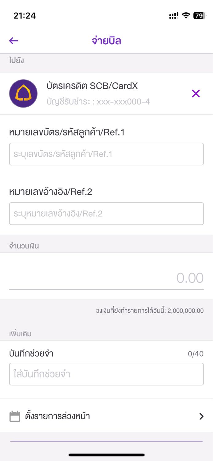 ปัจจุบัน ถ้าจะตั้งเวลาจ่ายบิลบัตรเครดิตของ SCB ในแอป ต้องเข้าไปที่เมนู ทำธุกรรม -> ชำระบิล แล้วต้องกรอกข้อมูลเลขบัตร จำนวนยอดที่จะชำระเอง ถึงจะเลือกตั้งเวลาจ่ายล่วงหน้าได้ตามรูป