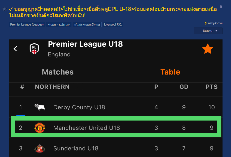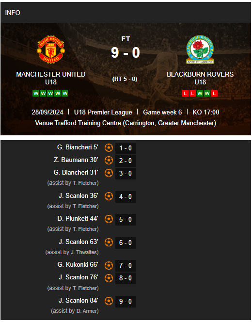 FT : MAN UTD เจ้าของแชมป์พรีเมียลีค 13 สมัย แชมป์ลีคสูงสุด 20 สมัย ทีมที่ฝว้าแชมป์ได้เยอะที่สุดในรอบ 2 ปีรองจากแมนซิตี้แค่ทีมเดียว และมีจำนวนแต้มมากกว่าจำนวนนัด 9 - 0 แบล๊คเบิร์น โรเวิร์ส