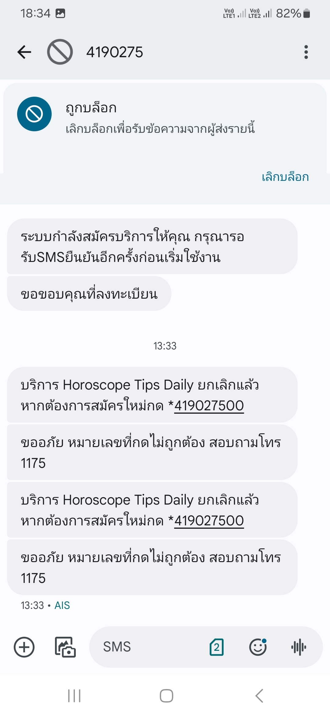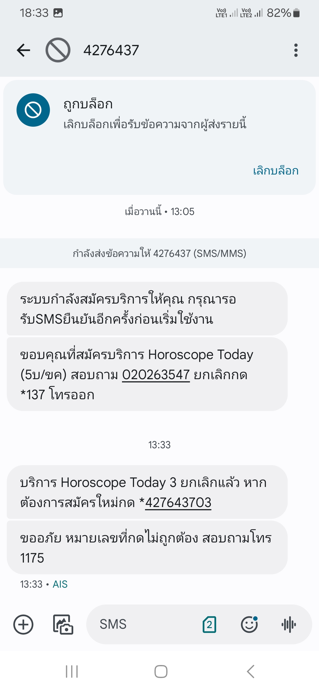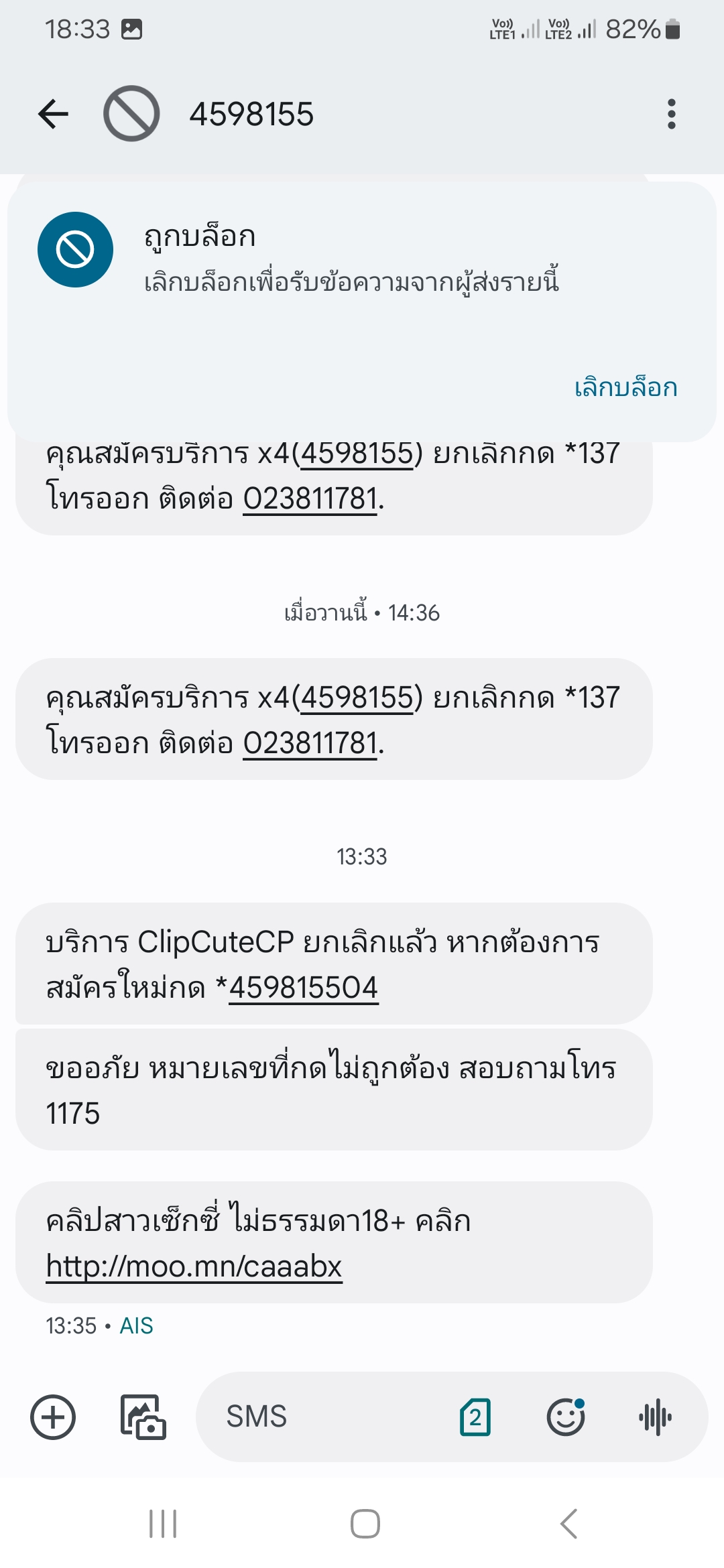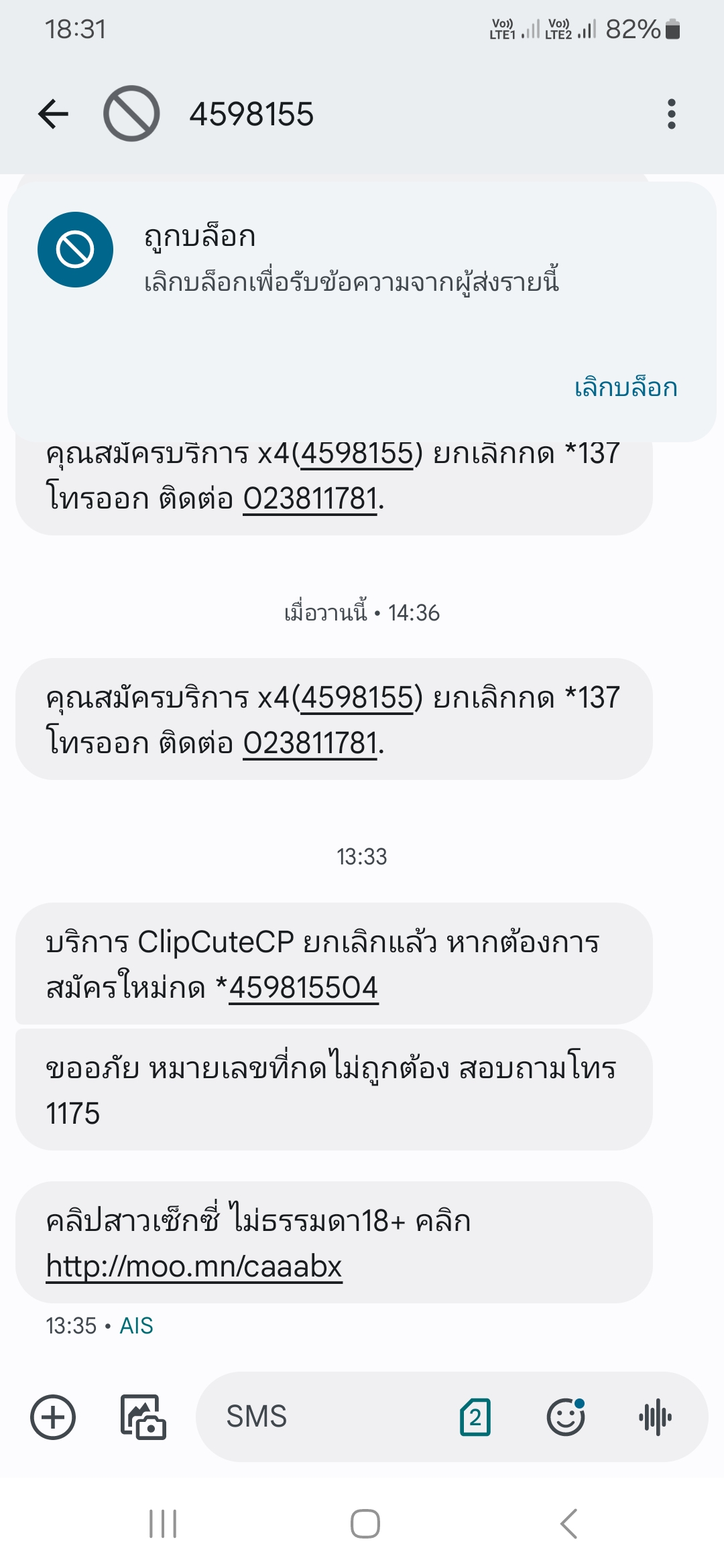 พอดีหลานสาวเผลอกดลิ้งก์แปลกๆครั้งนึงแล้วมันส่งข้อความมาไม่หยุดเลยค่ะตอนแรกกดยกเลิก sms ไปแล้วแต่รู้สึกเหมือนมันยังกินตังค์อยู่วันนี้เลยทำอีกรอบแต่ปรากฏว่าขึ้นตามภาพค่ะ Ais ช่วยเอามันหายไปเลยได้ไ