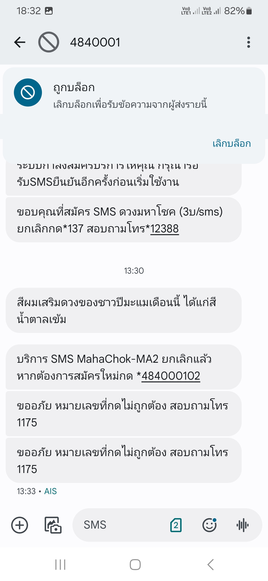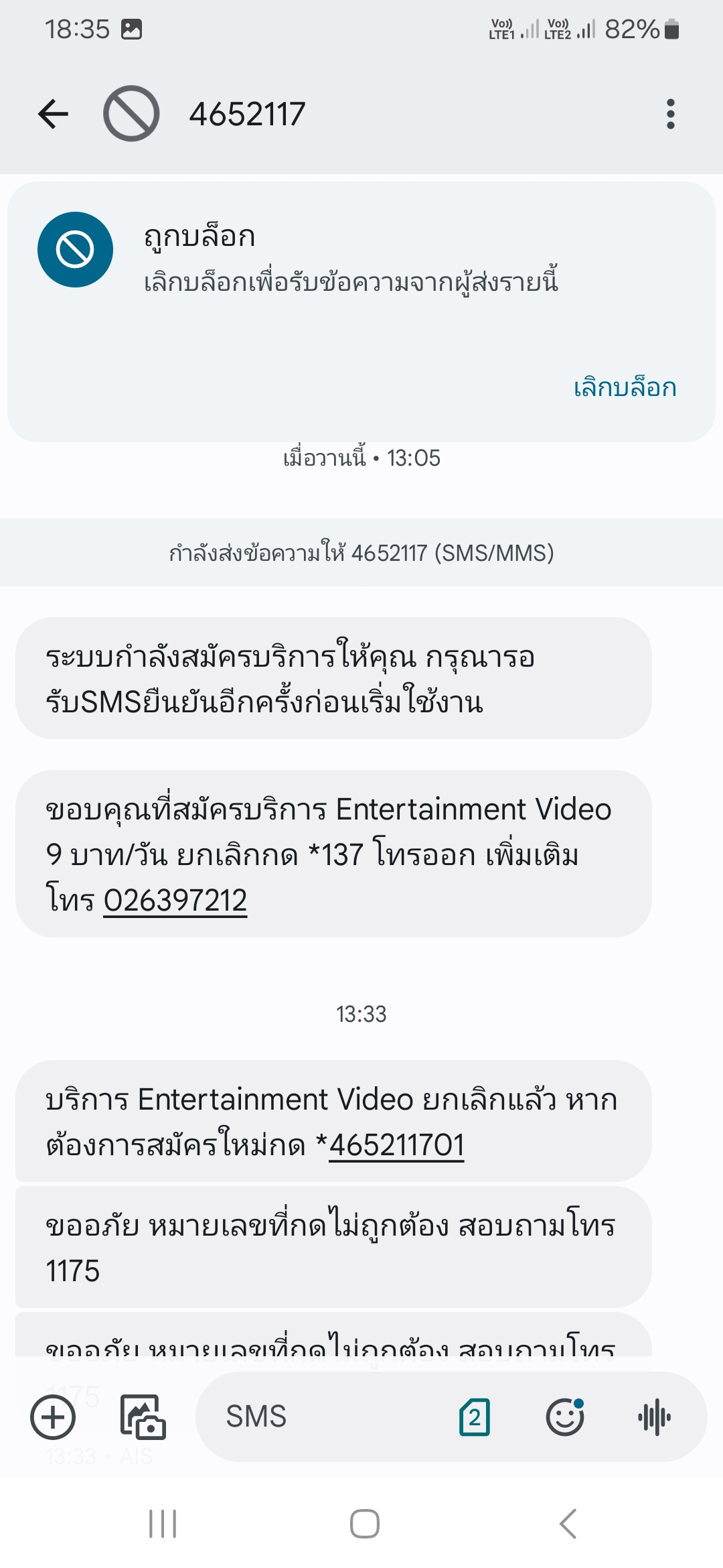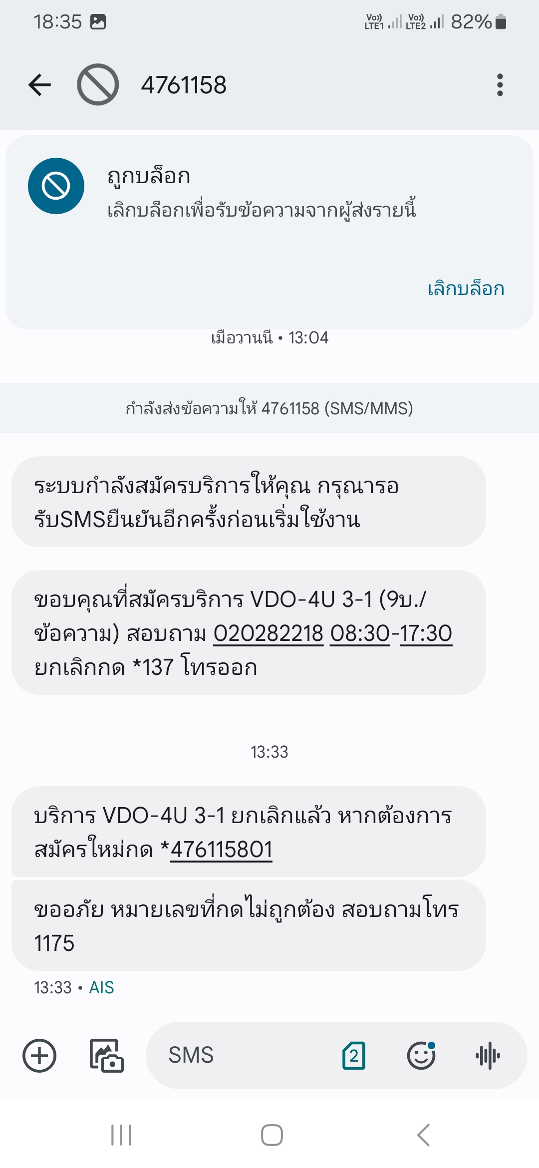 พอดีหลานสาวเผลอกดลิ้งก์แปลกๆครั้งนึงแล้วมันส่งข้อความมาไม่หยุดเลยค่ะตอนแรกกดยกเลิก sms ไปแล้วแต่รู้สึกเหมือนมันยังกินตังค์อยู่วันนี้เลยทำอีกรอบแต่ปรากฏว่าขึ้นตามภาพค่ะ Ais ช่วยเอามันหายไปเลยได้ไ