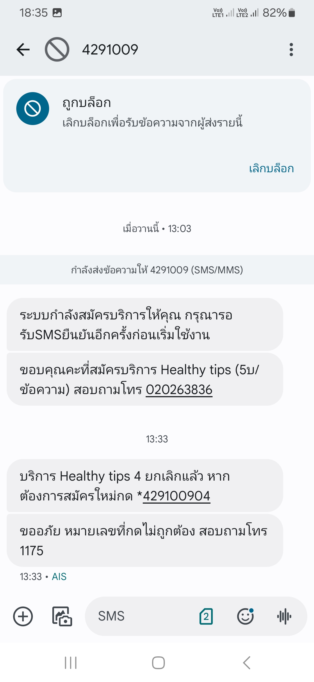 รู้สึกว่าเจอมิจฉาชีพใน sms ค่ะ ต้องการทราบยกเลิกสมัครค่าบริการ แบบยกเลิกเลยไม่มีในระบบของ Ais