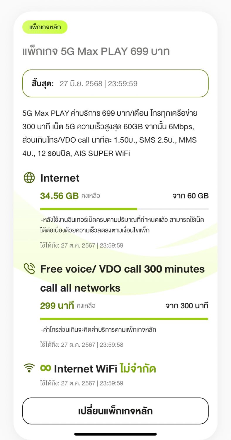 คือผมทำการเปลี่ยนจากเติมเงินเป็นรายเดือน AIS เมื่อสักครู่ โดยเลือกแพ็คเกจ 5G Special 399 บาท แต่พอเปลี่ยนแล้ว กับได้เป็นแพ็คนี้แทน เลยอยากได้คำอธิบายจาก AIS มากๆ เลยครับ
