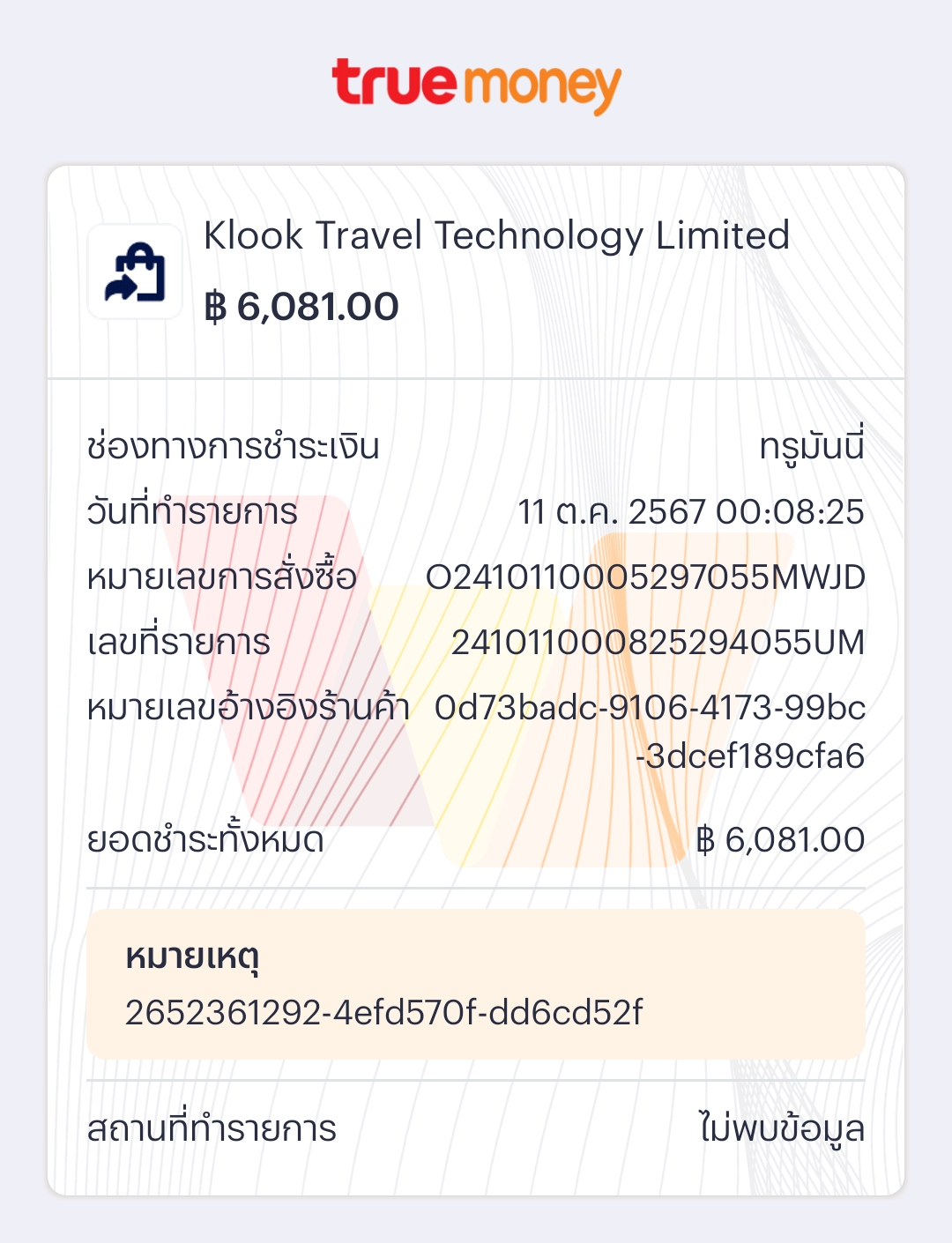 ทาง TrueMoney บอกผมว่า เงินโอนไปแล้ว ให้ผมไปตามกับ Klook เอง