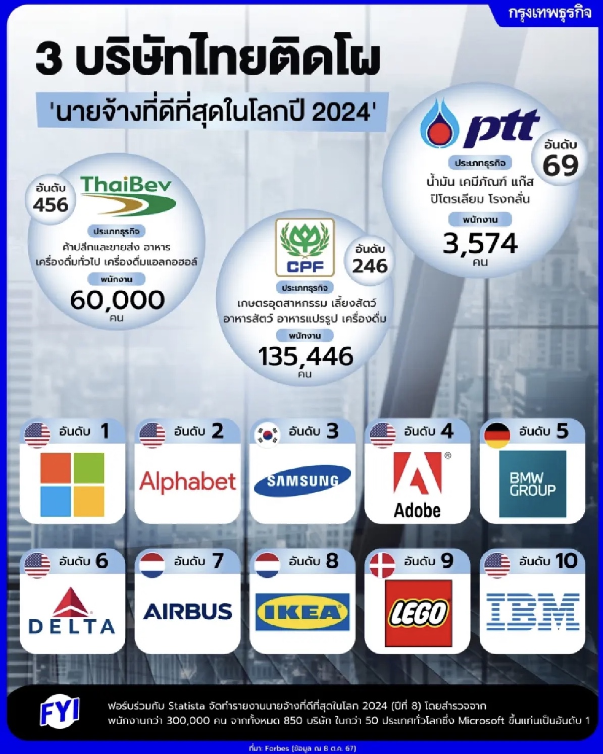 3 บริษัทไทยติดโผ 'นายจ้างที่ดีที่สุดในโลก 2024' สำรวจจาก 850 แห่งทั่วโลก