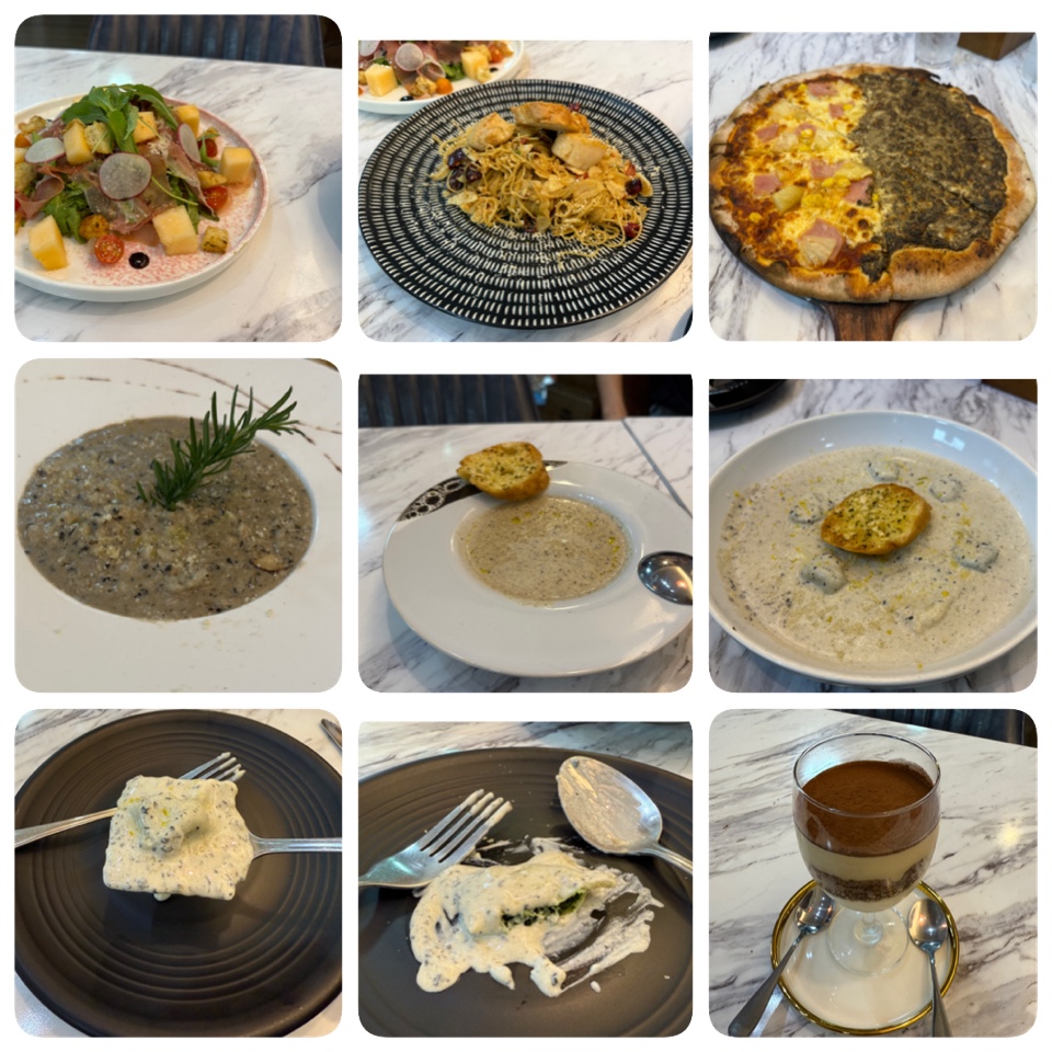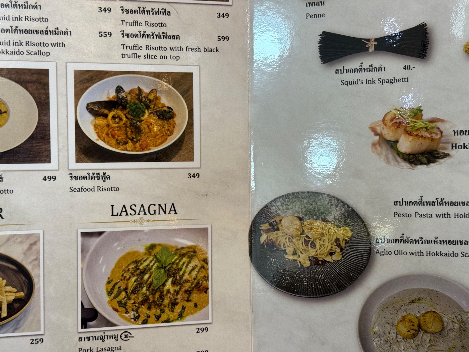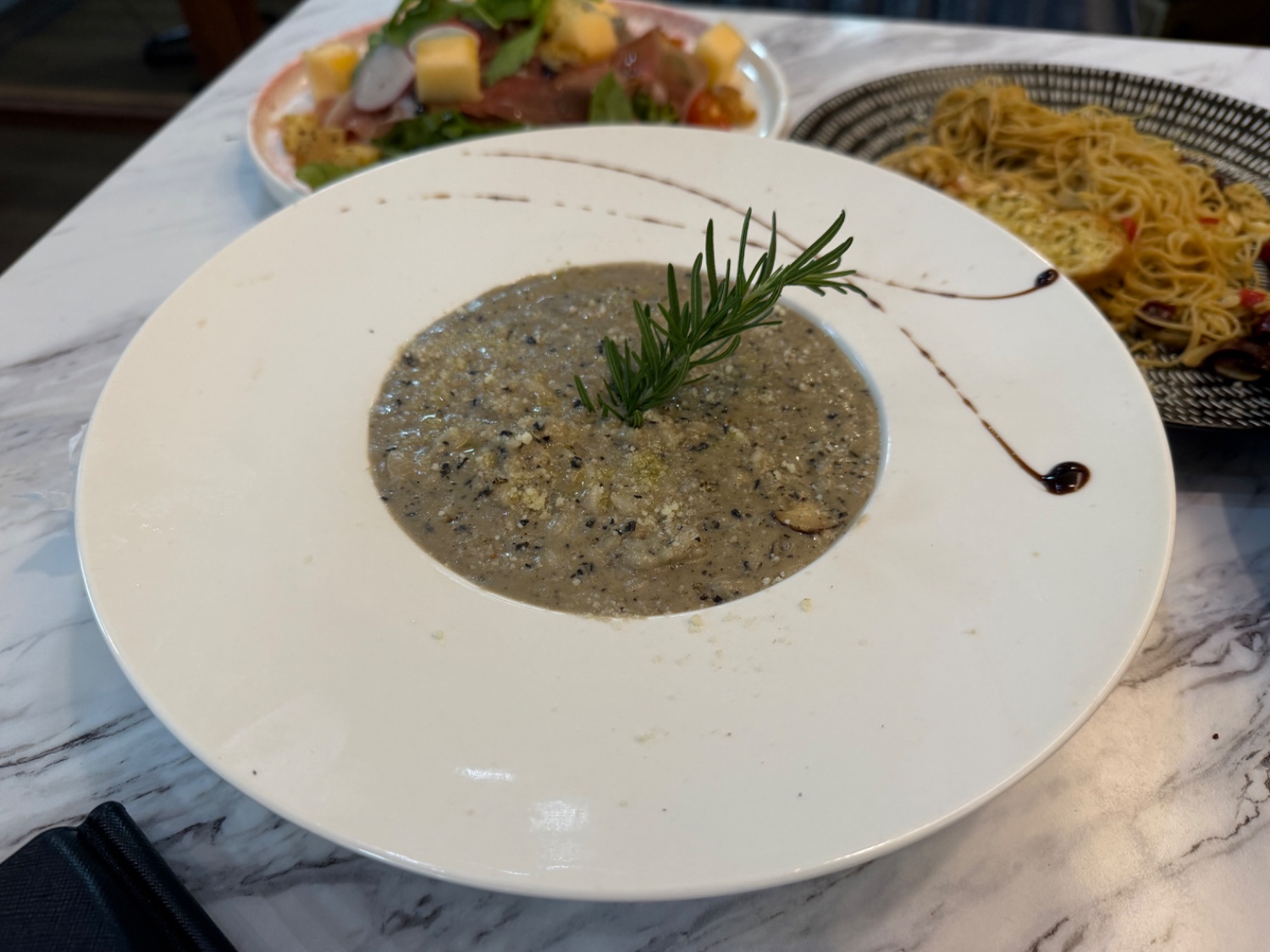 จานสี่ Risotto รีซอตโต จานนี้ก้ออร่อยและเสริฟมาเยอะขาดคนกินจุก เมล็ดข้าวกรุบๆกำลังดี ครีมอร่อยใส่หมึกดำ มีเนื้อปลาหมึก และเห็ดสไลด์หอมมัน อร่อยจานนี้ 349