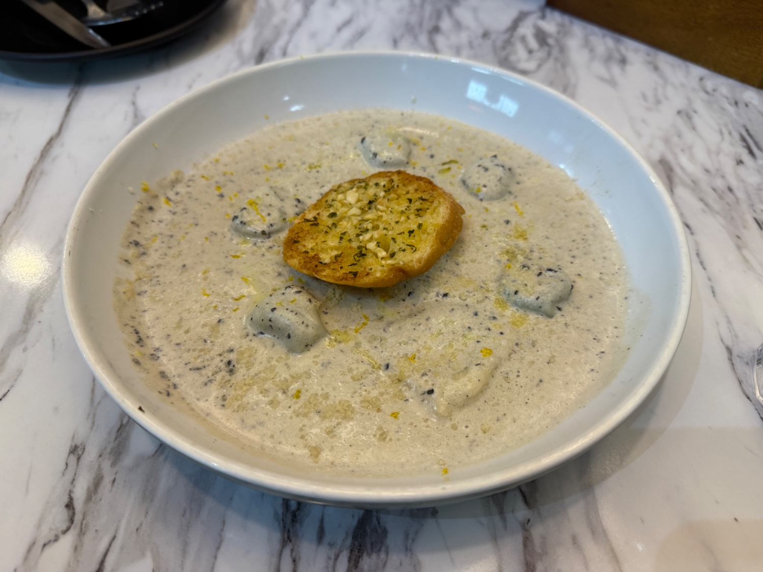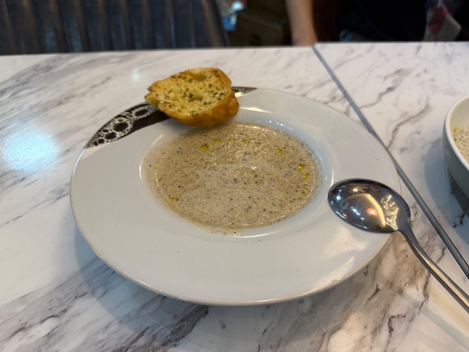 จานแรกซุปเห็ด 89 บาทเสริฟ มากับขนมปังกระเทียม มากี่ครั้งก้อสั่ง ปกติจะสั่งทรัฟเฟิ่ล แต่รอบนี้มีเมนูทรฟเฟิ่ลหลายจาน