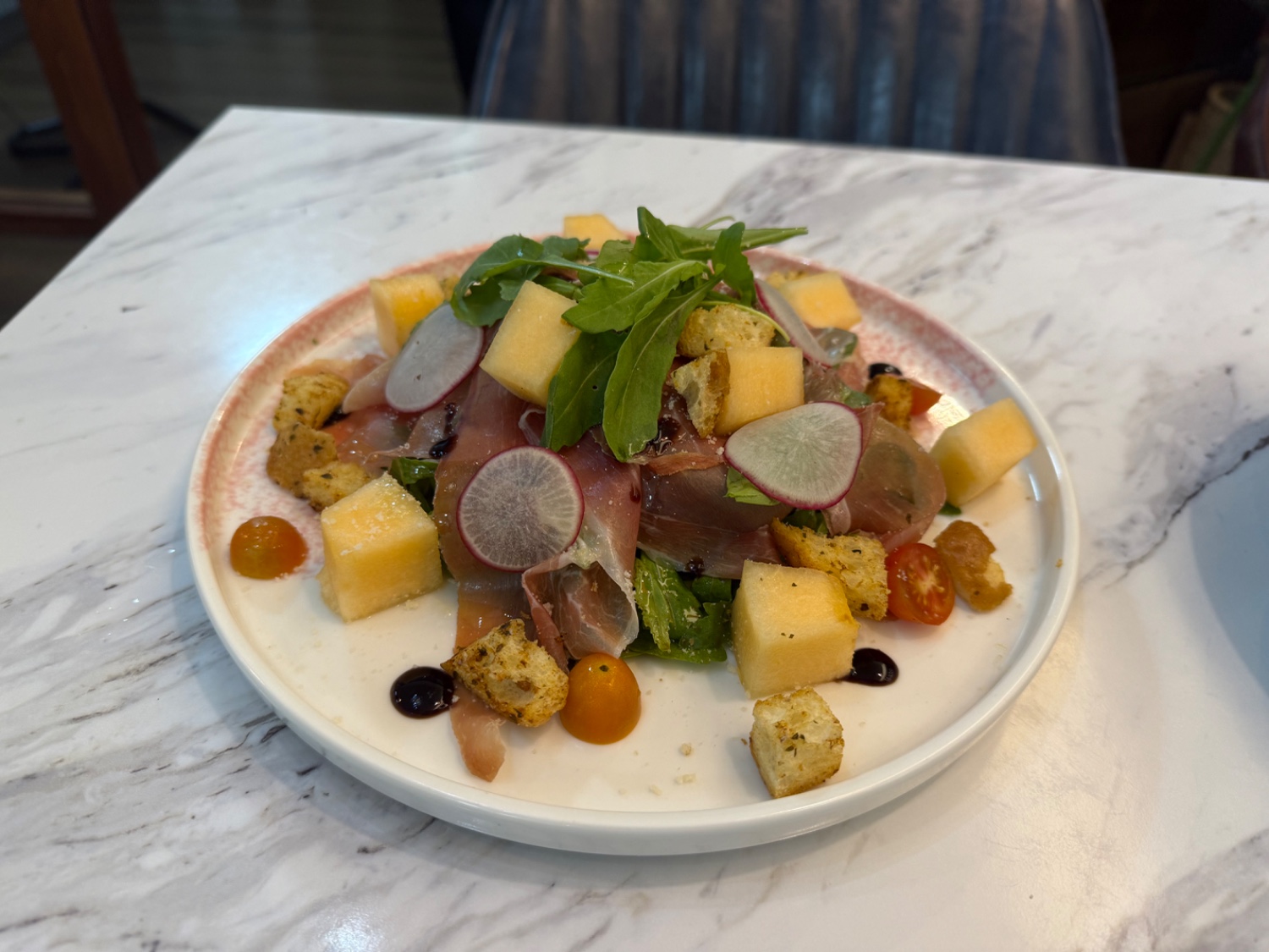 แต่อยากได้ผักด้วยเลย สั่งเป็นสลัดร้อคเก้ตพาร์มาแฮม มาแทน