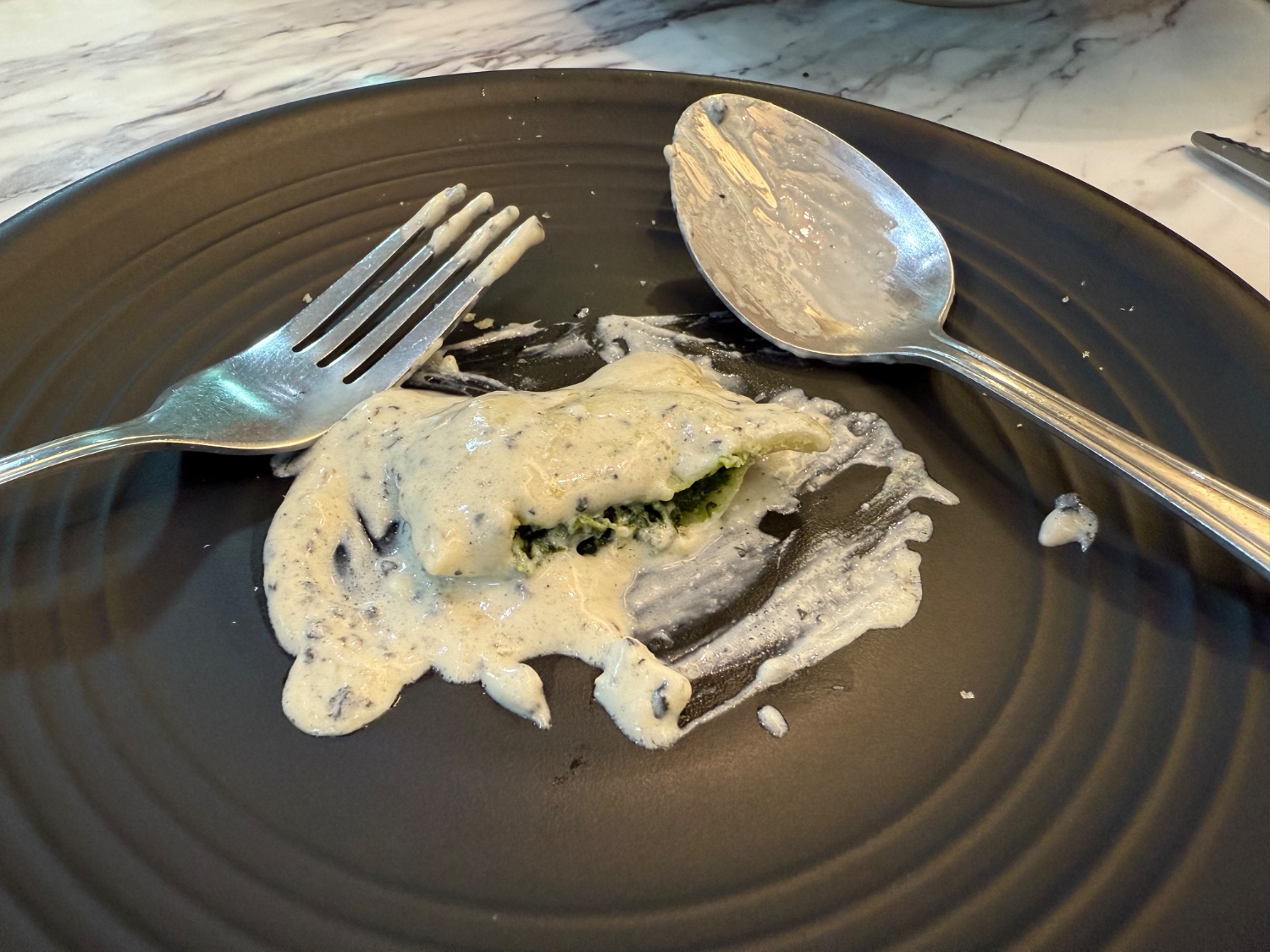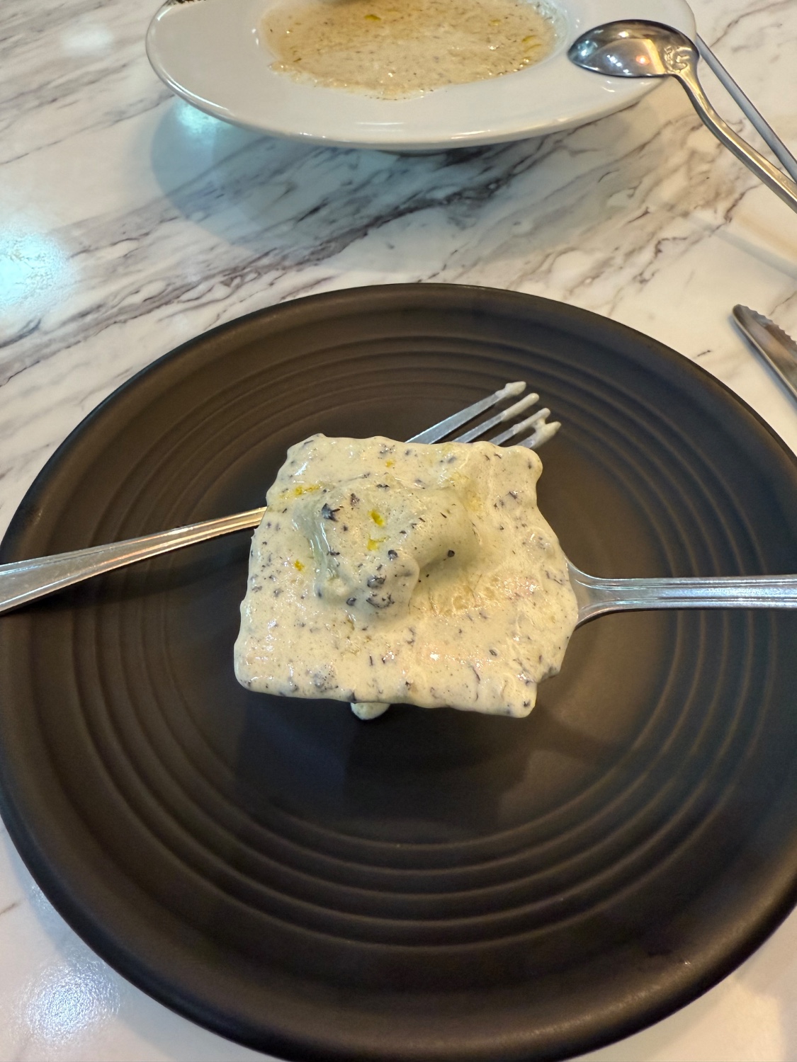 จาน 3 เมนคอร์ส วันนี้ อยากกิน Ravioli ไส้เนื้อซอร์สทรัฟเฟิ่ล แต่ที่นี่มี แต่ไส้ชีสกับผักโขม ราคา 299 ถามเชฟ บอกทำไม่ทันจริงๆ 555
