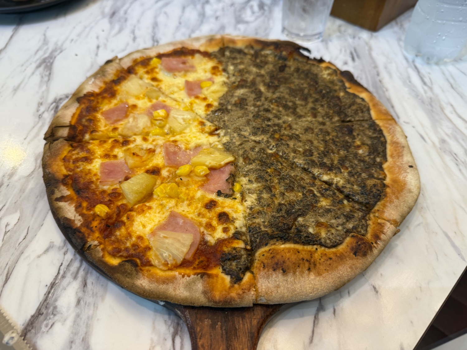 พิซซ่า ที่นี่ขนาดประมาณไซ์กลางสั่งสองหน้าเป็น Half Half ได้ วันนี้สั่งครึ่งทรัฟเฟิ่ลที่มาแบบแน่นๆกับฮาวายเอี้ยนพิซ่าหน้าขัดใจคนอิตาเลี่ยนแต่คนไทยชอบ อบในเตาถ่านคลาสสิคหน้าร้านกันเห็น สดจากเตามาเสริฟ แป้งบางกรอบหอมอร่อยถาดนี้ 319 แต่ทานได้แค่อย่างล่ะครึ่ง แน่นอนไม่ทิ้งหิ้วกลีบมากินต่อที่บ้าน