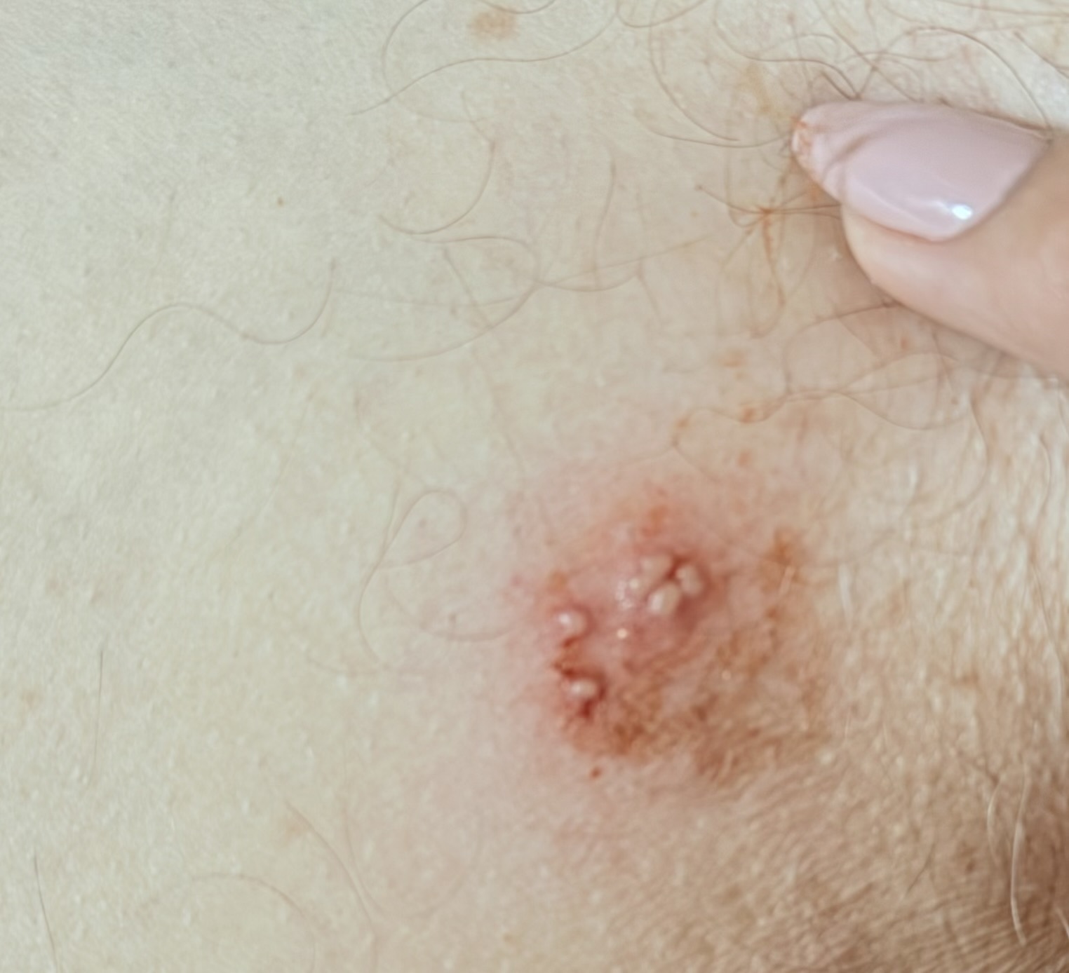 เป็นมาสองสามวัน เริ่มมีอาการเป็นหนองเเบบนี้คะ ไม่คัน เเต่จะเเสบเมื่อสัมผัส อันตรายมากมั้ยคะ