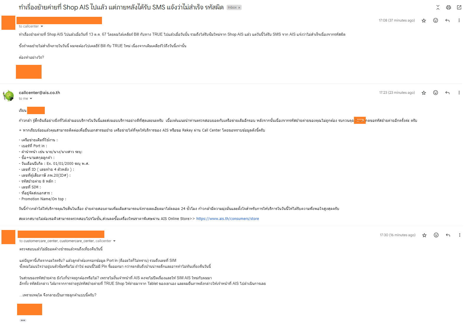 ทำเรื่องย้ายค่ายจาก TRUE ไป AIS ที่ Shop เมื่อวันที่ 13 ต.ค. 67 แต่วันนี้ได้รับ SMS จาก AIS ว่าย้ายไม่ได้ รหัสย้ายผิด