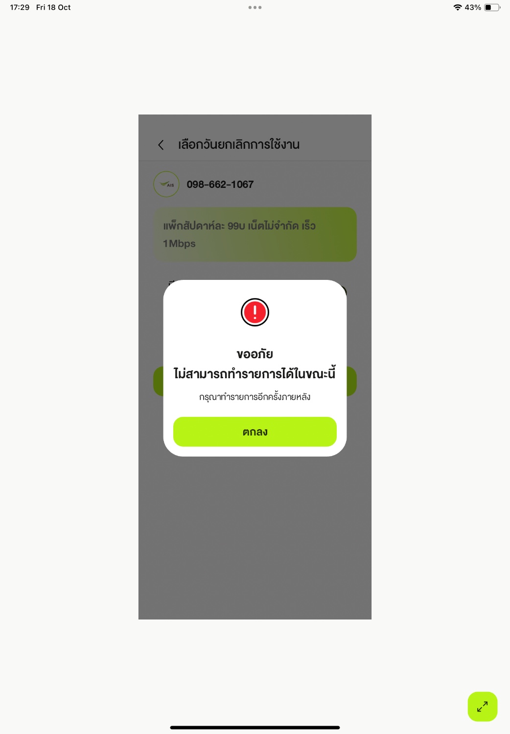 ต้องการยกเลิกแพ็กเกจ AIS SUPER WiFi, Unlimited AIS WiFi ค่ะ จะกดยกเลิกเองในแอป myAIS ก็แจ้งว่ายกเลิกไม่ได้ พอดีตั้งใจสมัครไว้ใช้เพียง 1 เดือนเพราะมาฝึกงานค่ะ แต่ตอนนี้เลย 1 เดือนแล้วแพ็กเกจก็ต่ออายุอ