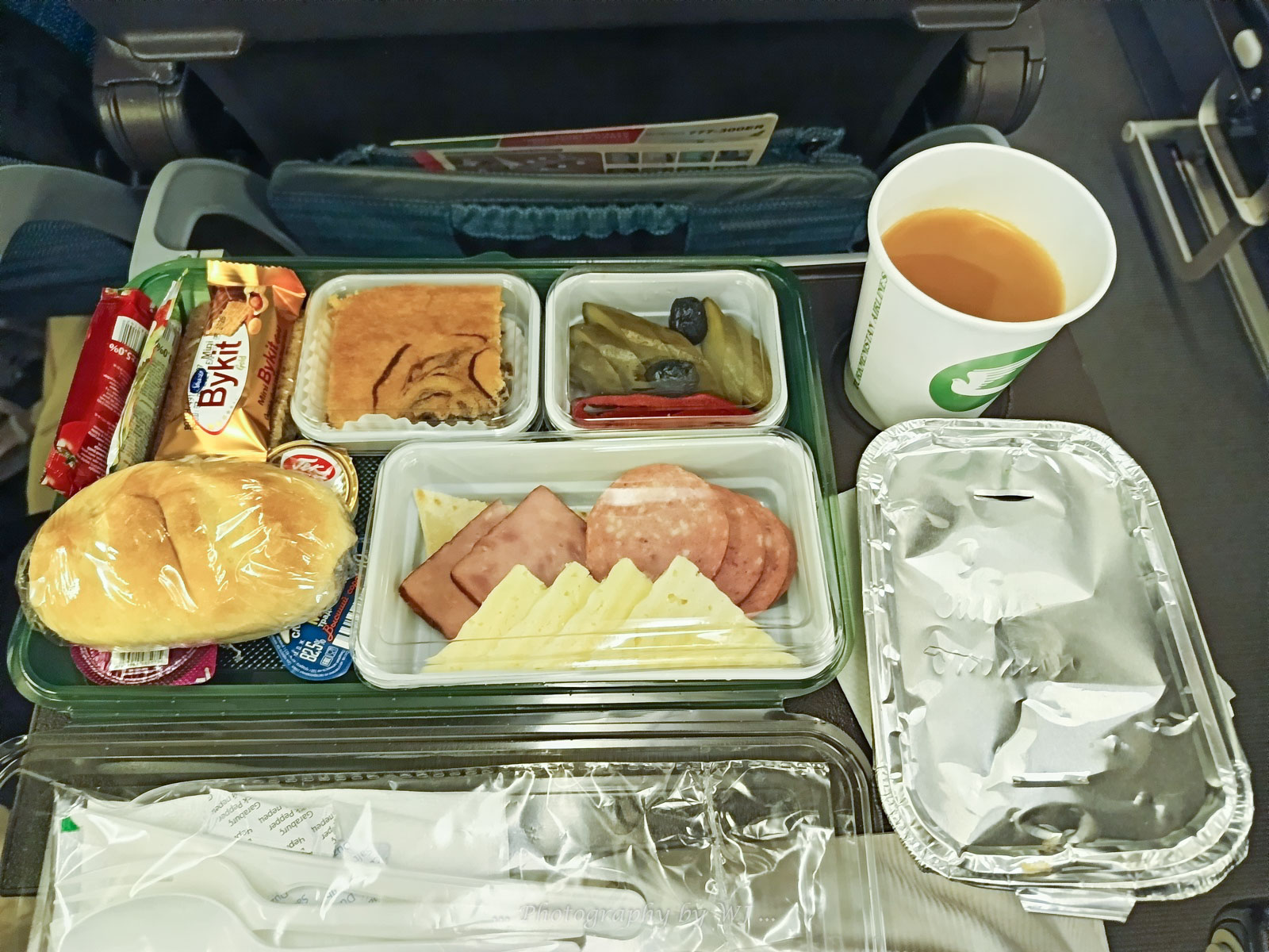 สำหรับอาหารมีเสิร์ฟ 2 ครั้ง ครั้งแรกเป็นอาหารหลักก่อน มีอะไรบ้างก็ตามภาพเลย ที่ปิดฟอยด์อยู่ก็เป็นสปาเก็ตตี้กับไก่หรือเนื่อ ทานกันอิ่มและไม่หมดด้วย ส่วนรสชาติก็เลี่ยนหน่อยตามสไตล์อาหารบนเครื่องบิน ครั้งที่ 2 ก็เป็นแซนวิชชิ้นใหญ่ 2 ชิ้น กับน้ำแล้วแต่จะเลือกเป็น ชา กาแฟ น้ำผลไม้ น้ำอัดลม น้ำเปล่า ก็อิ่มอยู่นะ