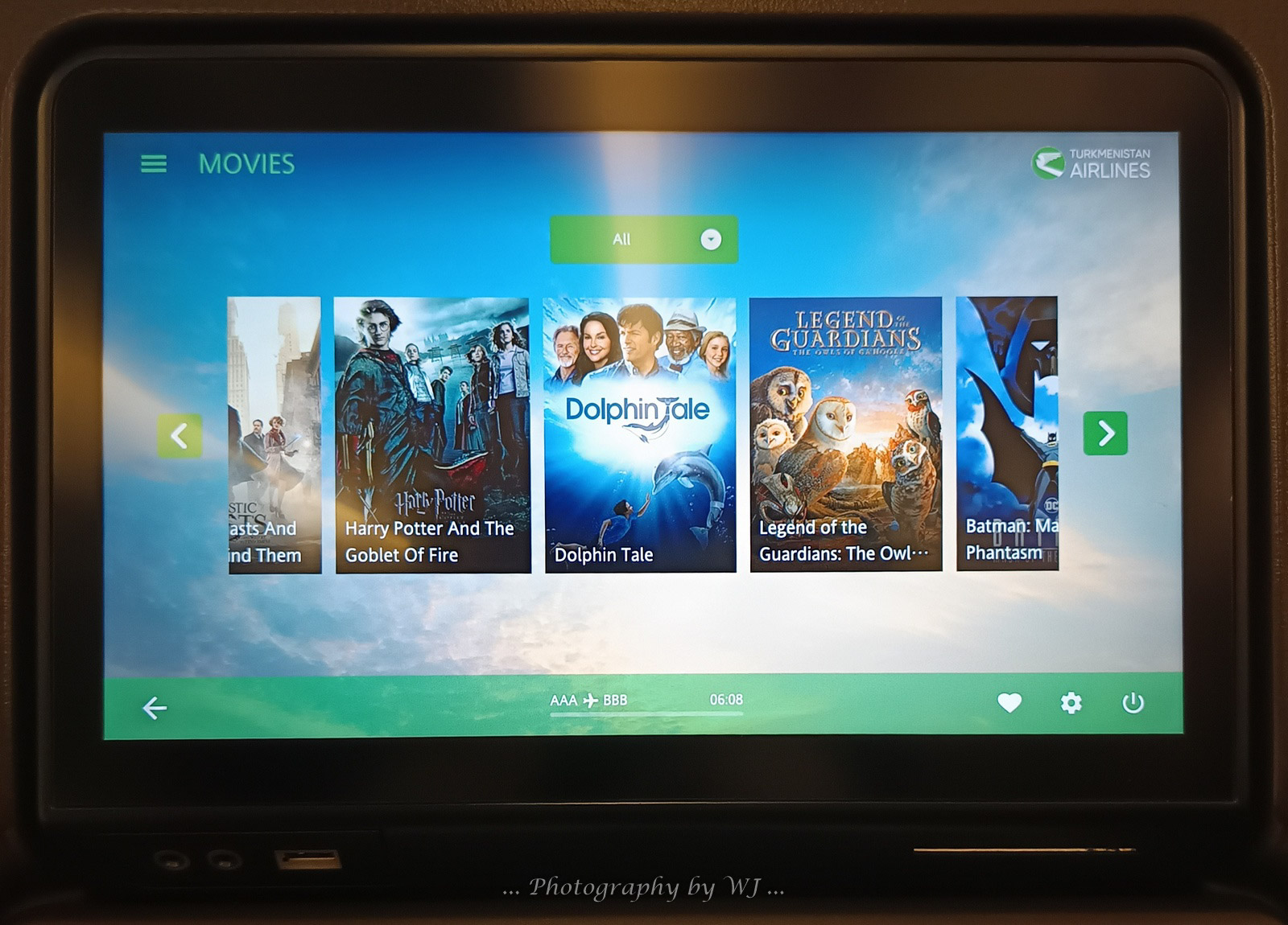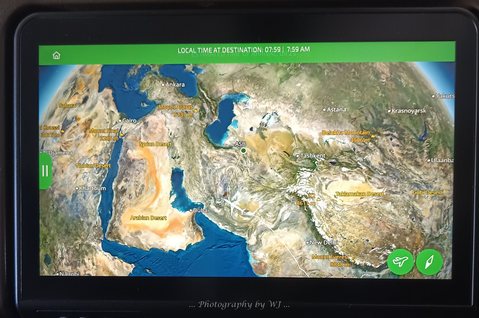 BKK-ASB เป็นเครื่องบินลำใหญ่ BOEING 777-300ER ที่นั่ง 3-4-3 มีจอ LCD ส่วนตัวทุกที่นั่ง มีหนังให้ดูเยอะเลย หนัง Hollywood ก็มีหลายเรื่อง และยังมี MAP ที่แทร็กการเดินทางแบบเรียลไทม์ ได้เปิดดูเพลินๆแก้เบื่อกันไป แต่เราก็อยากจะนอนมากกว่า