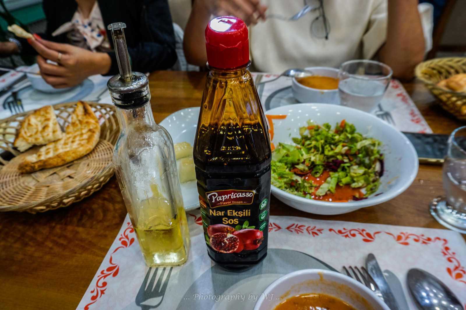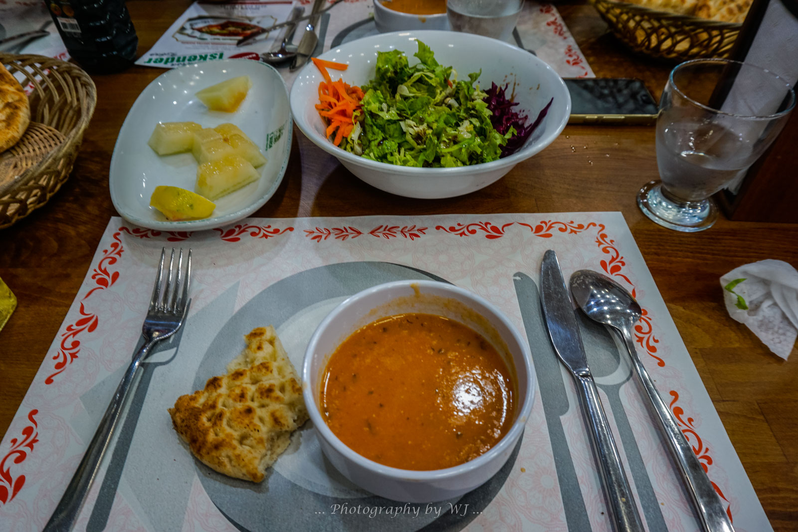 หลังจากออกจากสนามบิน เราไปรับประทานอาหารเย็นที่ร้าน Bursa... เป็นอาหารตุรกีมื้อแรก ออร์เดริฟเป็นซุบมะเขือเทศ ขนมปัง สลัดผักกับน้ำสลัดเป็นซอสน้ำทับทิม+น้ำมันมะกอก+น้ำมะนาว (มีแบบนี้ทุกมื้อ) หลังจากนั้นเป็นข้าวกับเนื้อหรือไก่ กึ่งผักกึ่งทอดน้ำมัน รสชาดก็แปลกไปจากอาหารไทยพอสมควร
