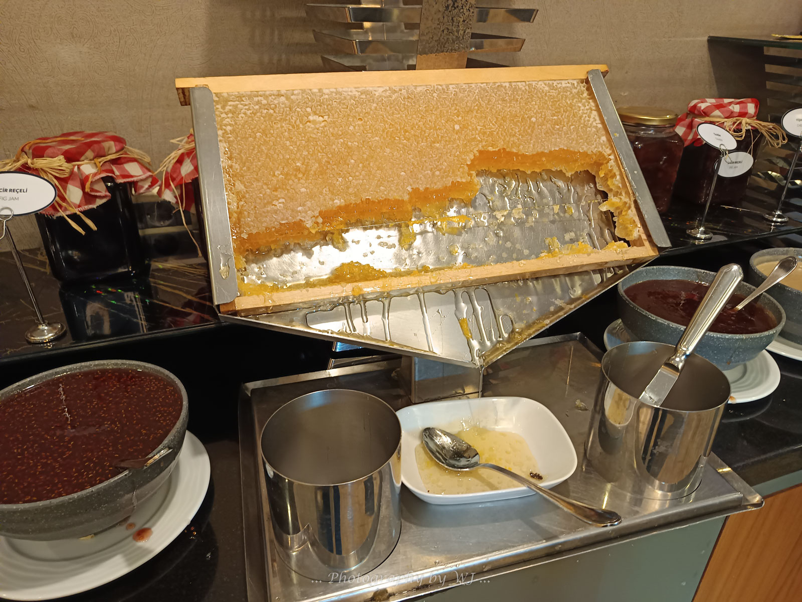 อาหารเช้าที่โรงแรม มีอาหารให้เลือกหลากหลายดี มีขนมปังกาแฟ ผักสลัด นม ซีเรียล ชีสมีหลายชนิดเลยแต่เราไม่ถนัดนัก หยิบเอามาชิมบ้าง มีแฮม โรตี โยเกิร์ต น้ำผึ้ง ขนมหวาน ฯลฯ