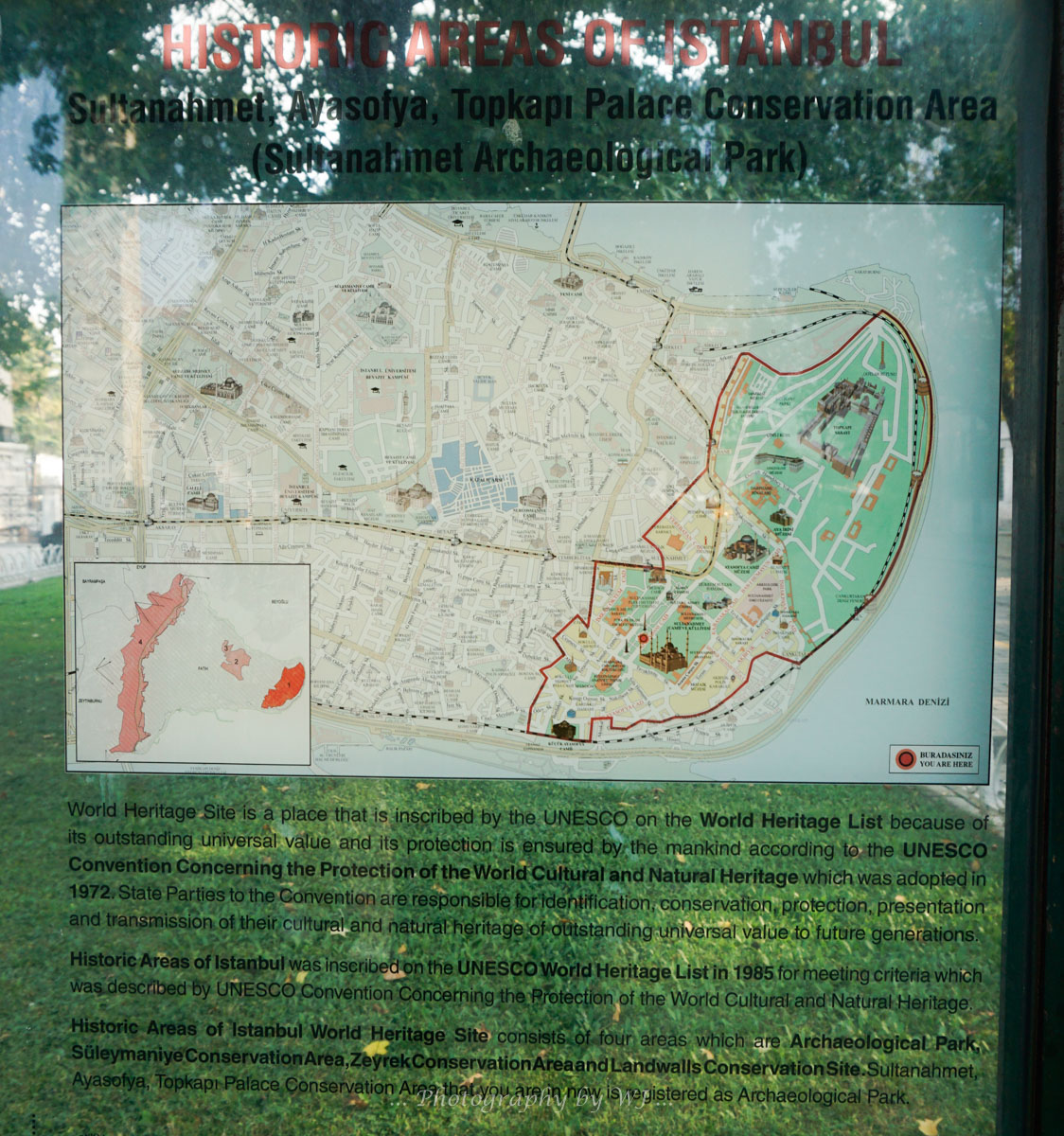 สถานที่แรกที่ไปเยี่ยมชมคือบริเวณพื้นที่ประวัติศาสตร์แห่งอิสตันบูล ซึ่งได้รับการขึ้นทะเบียนเป็นมรดกโลกในปี 1985 ตามรูปด้านฃ้างคือพื้นที่ในกรอบสีแดงด้านขวา ซึ่งประกอบไปด้วย ฮิโปโดรมหรือจตุรัสสุลต่านอาเหม็ด สุเหร่าสีน้ำเงิน วิหารฮาเกียโซเฟีย พระราชวังทอปกะปึ