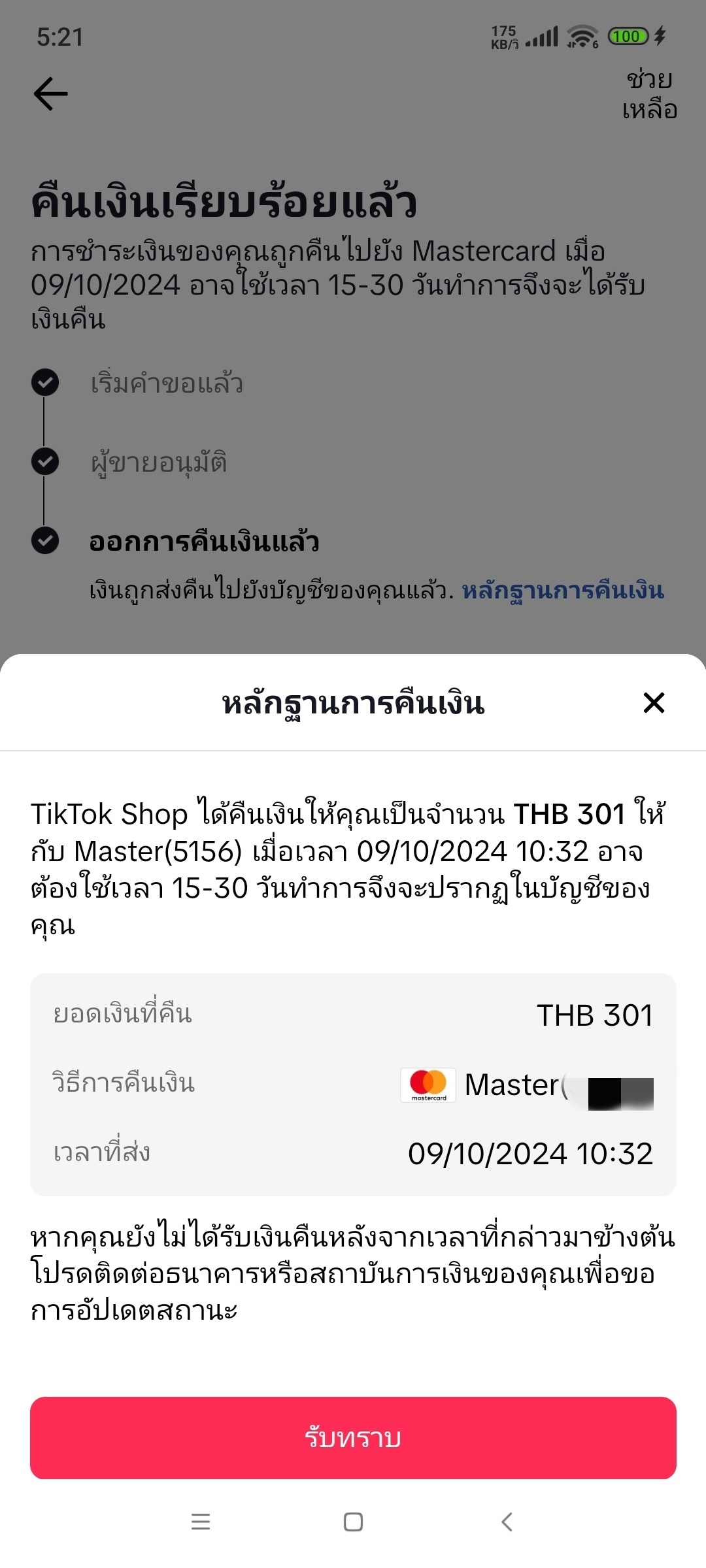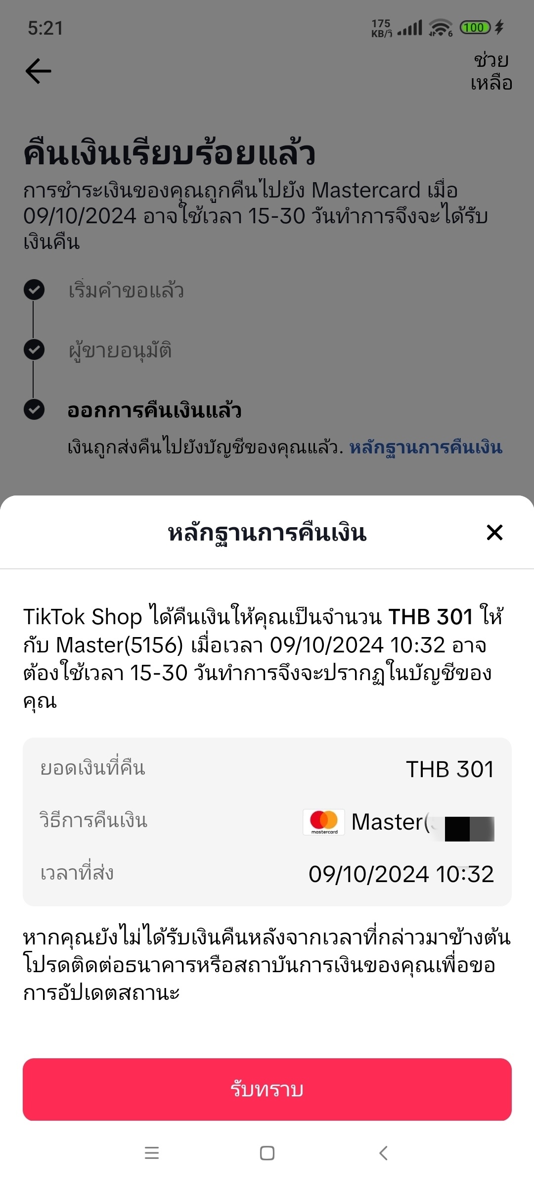 เงินคืนเข้าบัตร Tiktok
