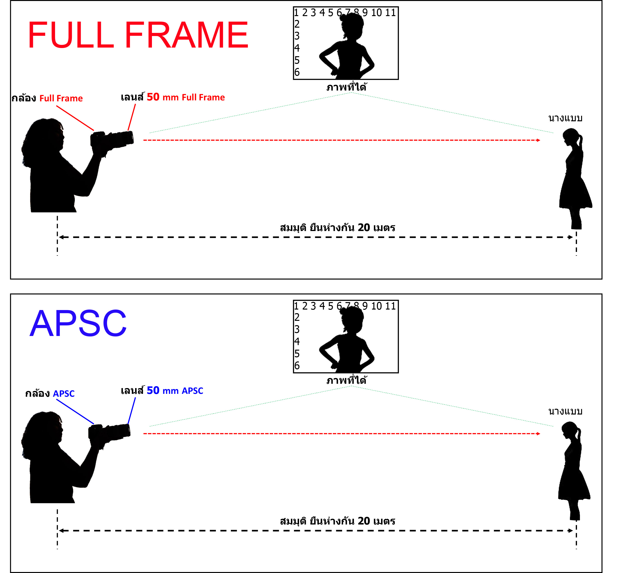 1. กล้อง APSC + เลนส์ 50 mm APSC ภาพที่ได้จะเหมือนกัน กับ กล้อง Full frame + เลนส์ 50 mm Full frame (ถ้ายืนห่างจากแบบเท่าเดิม) เหมือนตามภาพที่แสดงด้านล่างนี้ ( ตามภาพข้างล่างนี้ถูกต้องไหม)