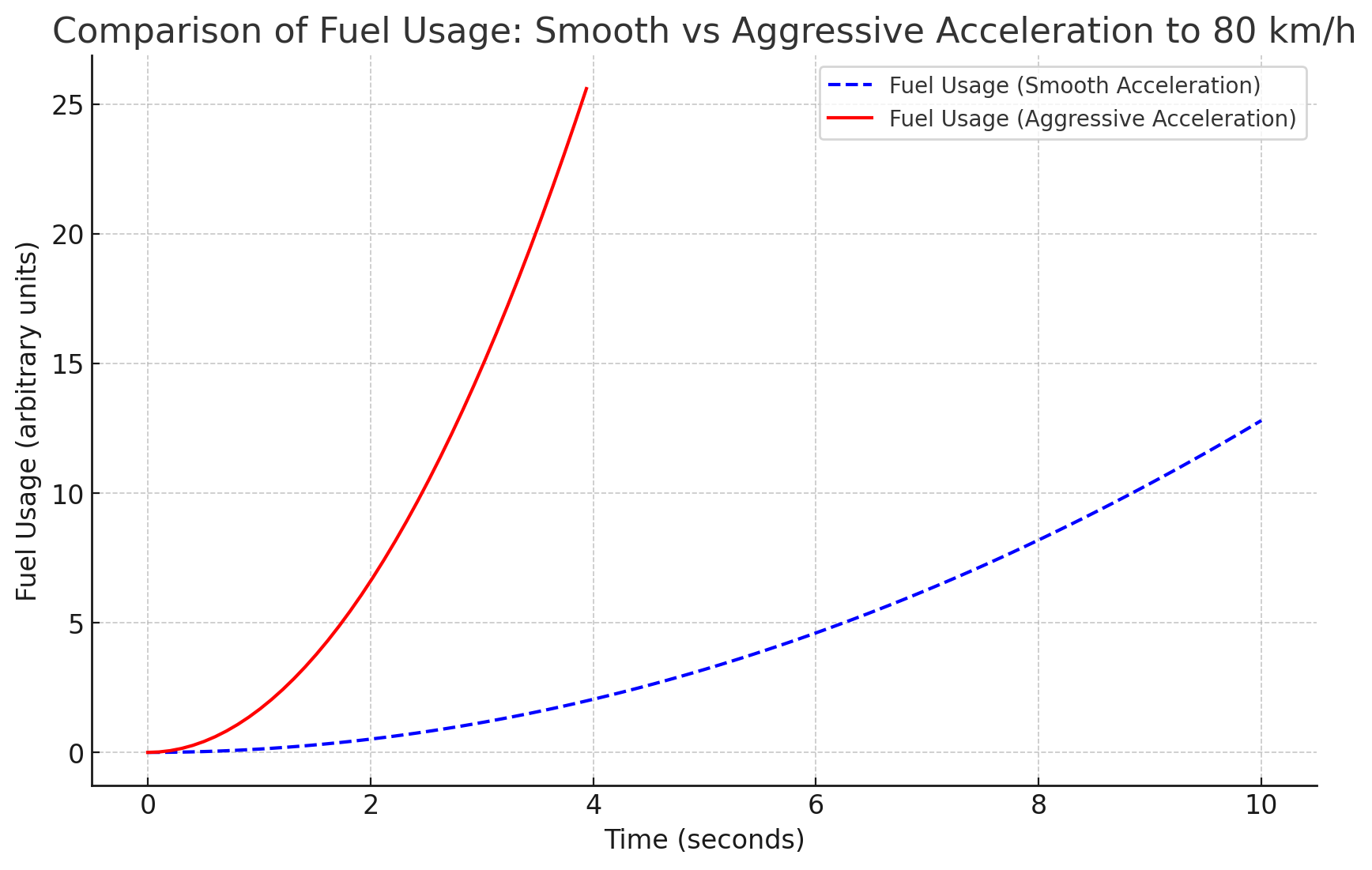 สรุปอีกรอบ มันขึ้นอยู่กับการเร่งของท่าน มวลในรถ และจะแถมเรื่องความเร็วที่เหมาะสมในตอนท้าย ก่อนอื่นขอโชว์กราฟก่อน กราบchatgptที่สร้างให้