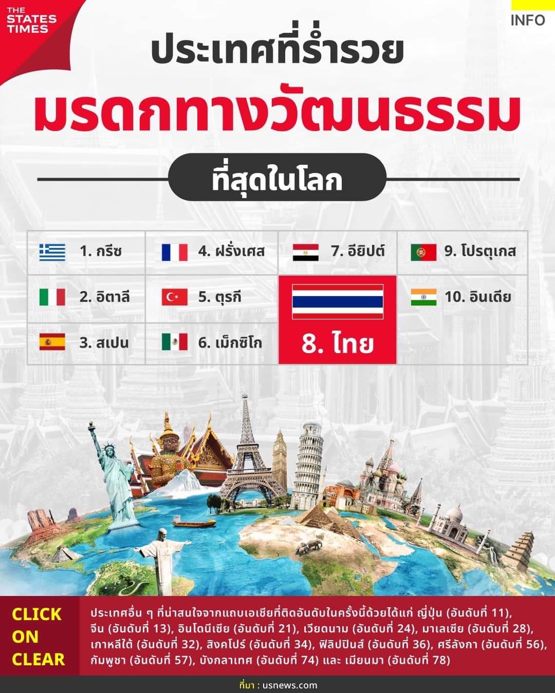 (27 ต.ค. 67) สำนักข่าวและเว็บไซต์ยูเอสนิวส์ แอนด์ เวิลด์รีพอร์ต รายงานการจัดอันดับ ‘ประเทศที่ร่ำรวยมรดกทางวัฒนธรรมที่สุดในโลก’ ซึ่งมีทั้งหมด 89 ประเทศ และในจำนวนนี้ ประเทศไทยติดอยู่ใน 10 อันดับแรก โดยจัดเป็นลำดับที่ 8 อีกทั้งยังเป็นอันดับที่สูงที่สุดของกลุ่มประเทศเอเชีย