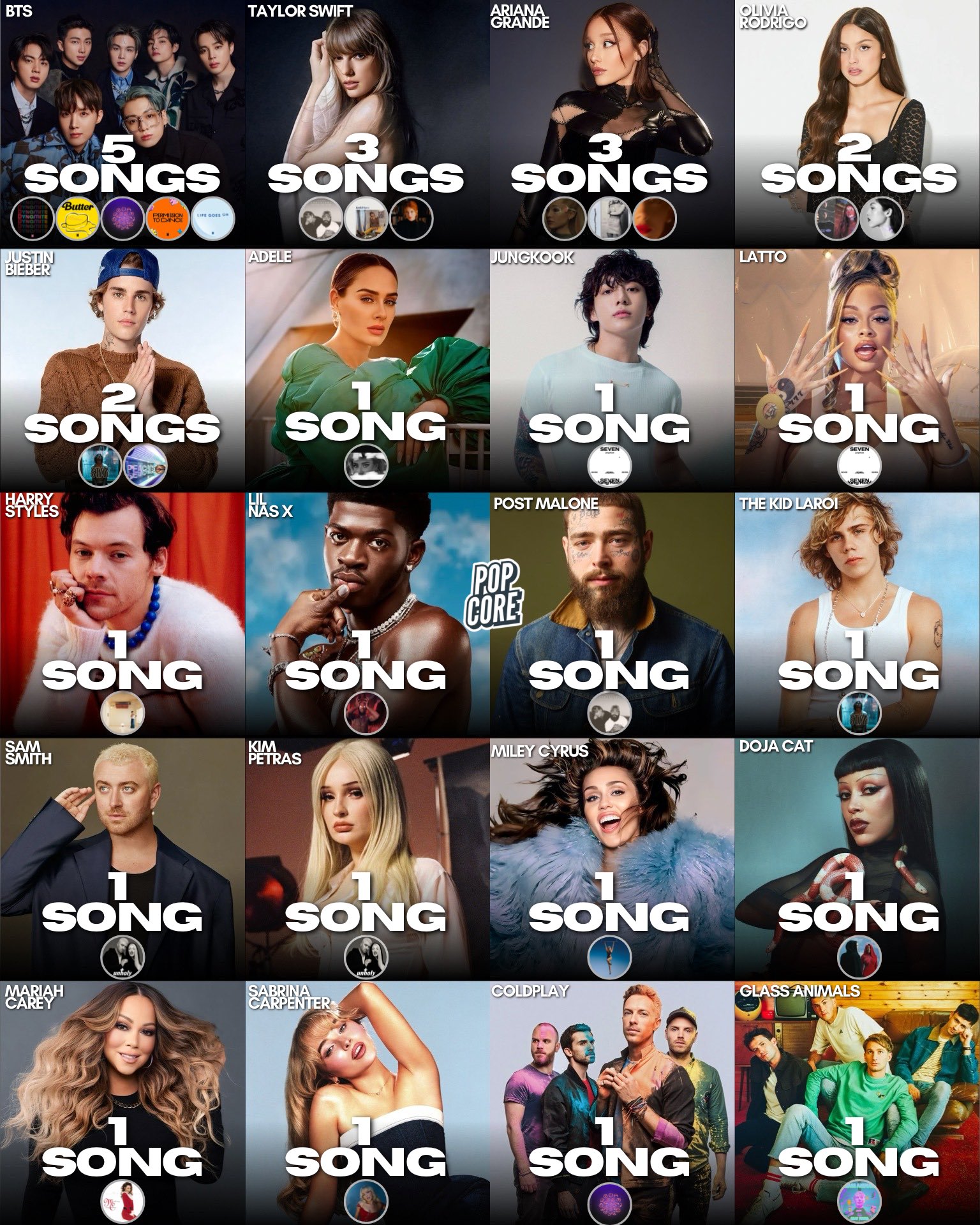 ศิลปินที่มีเพลงมากที่สุด ที่ขึ้นถึงอันดับ 1 บนชาร์ต Billboard Hot 100, Global 200 และ Global Excl. US พร้อมกัน