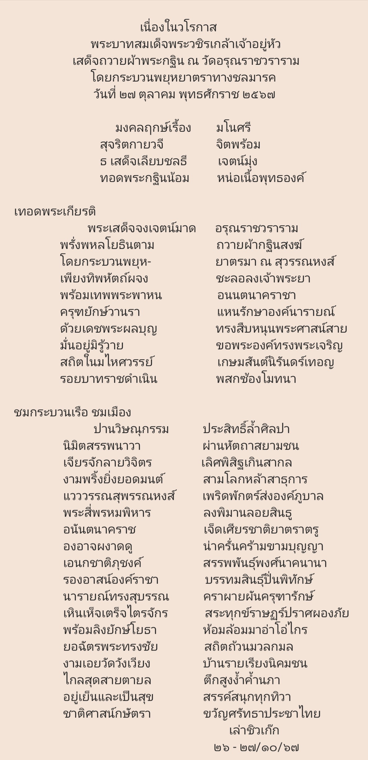 พระบาทสมเด็จพระเจ้าอยู่หัวเสด็จถวายผ้าพระกฐินโดยกระบวนพยุหยาตราทางชลมารค ณ วัดอรุณราชวราราม ๒๗ ตุลาคม ๒๕๖๗