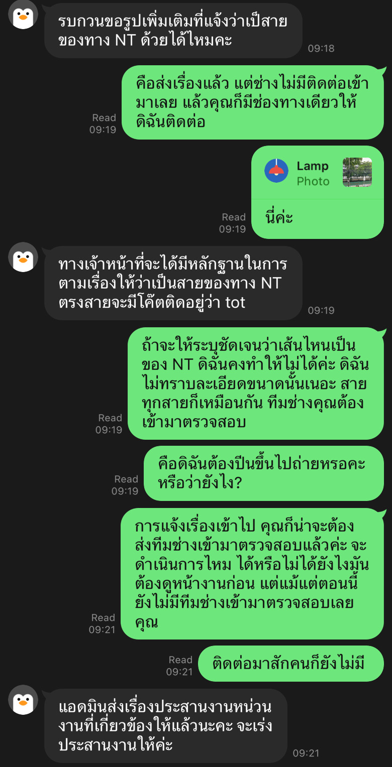 "ประสานงานกับทีมช่างเทคนิคให้ติดต่อกลับแล้วนะคะ แต่ยังไงจะเร่งประสานงานเพิ่มให้ อยากให้ทางคุณลูกค้า ช่วยถ่ายรูปเพิ่มเติมของสายสื่อสารที่ระบุว่าเป็นของเรามาให้เพิ่มเติมหน่อยได้ไหมคะ จะมีตัวอักษร อยู่บนสาย" คำถามคือ นี่ฉันต้องปีนขึ้นไปถ่ายรูปให้คุณหรอเนี่ย? คุณพระช่วย!! งั้นจะมีทีมงานช่างของคุณไว้ทำไมเอ่ย?