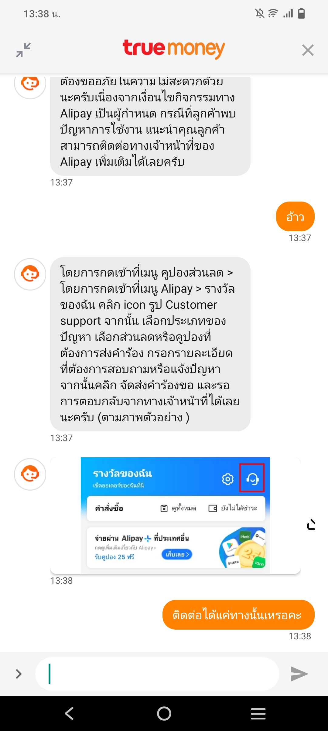 พักนึงก็เลยติดต่อเจ้าหน้าที่ของ "TrueMoney" แต่ทางนั้นเช็คแล้วก็บอกให้เราติดต่อเจ้าหน้าที่ของ Aalipay+Rewards แทน เราลองกดดูก็ไม่รู้ว่าจะแจ้งทางนั้นยังไง เพราะเราก็ยังสับสนว่าตกลงเราถูกรางวัลใช่ไหม