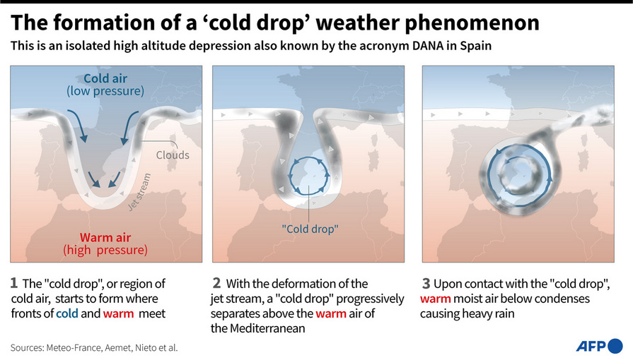 อากาศเย็นในระดับชั้นบรรยากาศที่สูง(ที่ความสูงราวๆ 9 กม.) แยกตัวออกมาจากกระแสลม Jet Stream เคลื่อนตัวลงมาบริเวณแถวสเปน ในขณะที่มาเจอกับอากาศอุ่นชื้นเหนือน่านน้ำทะเลเมดิเตอร์เรเนียนที่มีไอน้ำอยู่มาก ทำให้เกิดการยกตัวของอากาศอย่างรวดเร็ว ก่อตัวเป็นเมฆพายุฝนอย่างหนาแน่น