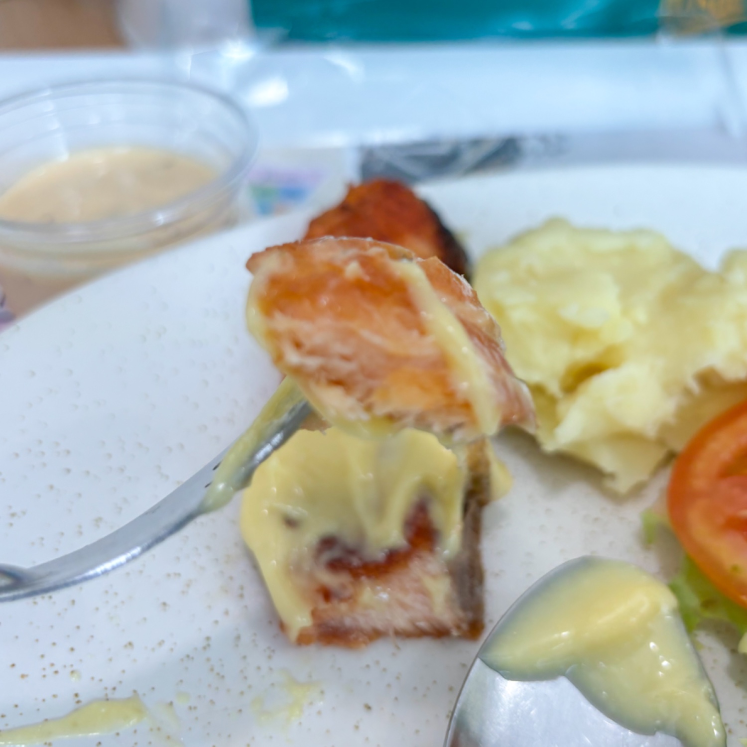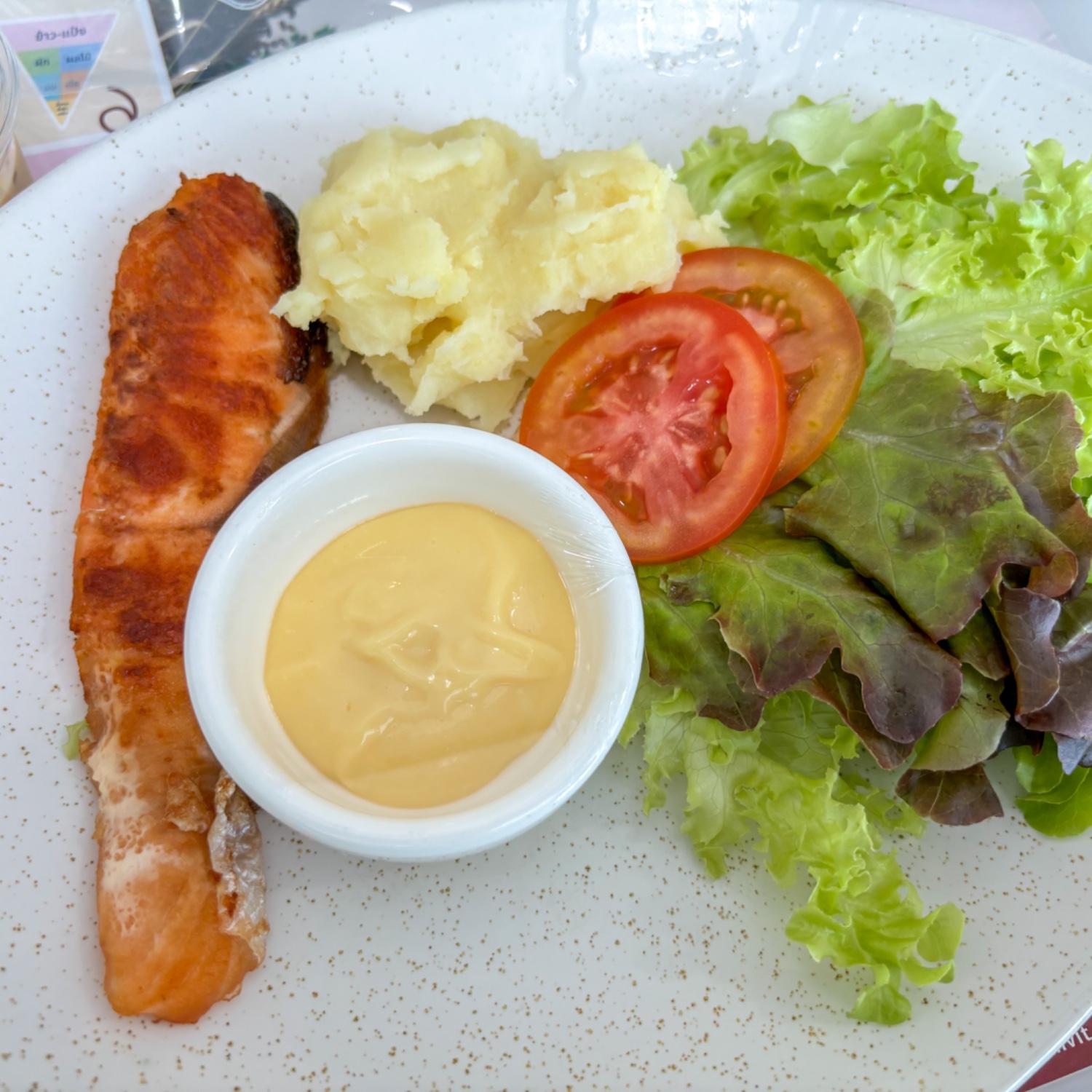 จานนี้เป็นสเต๊กปลาแซลมอนมัสตาร์ดมะนาว