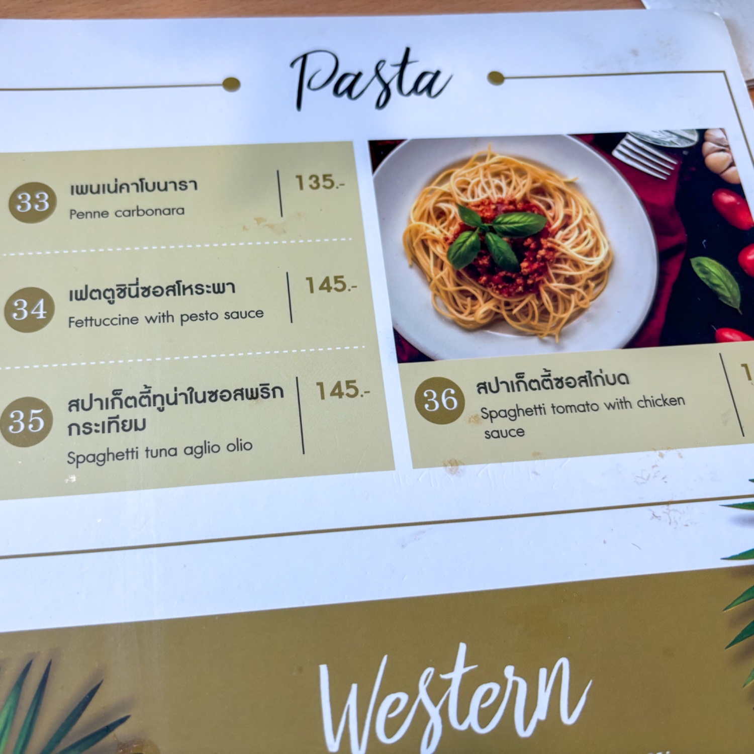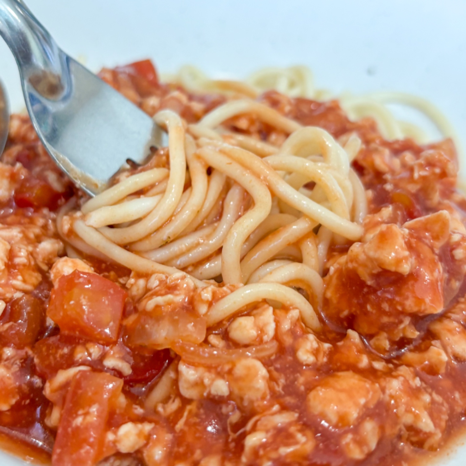 สปาเก๊ตตี้ไก่สับกับผลไม้ มีน้ำมะตูมแบบไม่หวานเลย พร้อมผลไม้