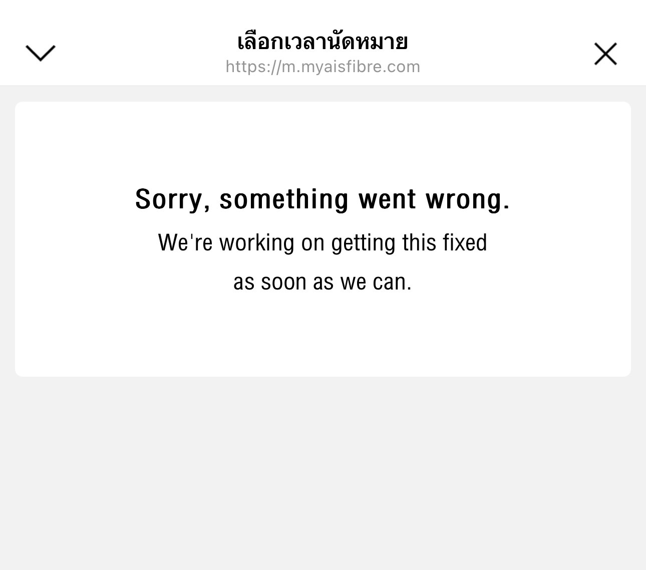 วันนี้ เน็ตบ้าน AIS Fibre เสียตั้งแต่เช้า (วันก่อนก็เสีย) วันนี้ก็เลยโทรเข้า CC 1175 ตั้งแต่เช้า ระบบอัตโนมัตรับเรื่อง บอกสายสัญญาณเน็ตเสีย แจ้งให้กดเลือกวันนัดในลิงค์ที่ส่งมาให้ ผมก็กดลิงค์ตั้งแต่เช้า ยัน เที่ยงวันก็แล้ว ลิงค์มันก็ล่มอยู่อย่างงั้น ตามรูป