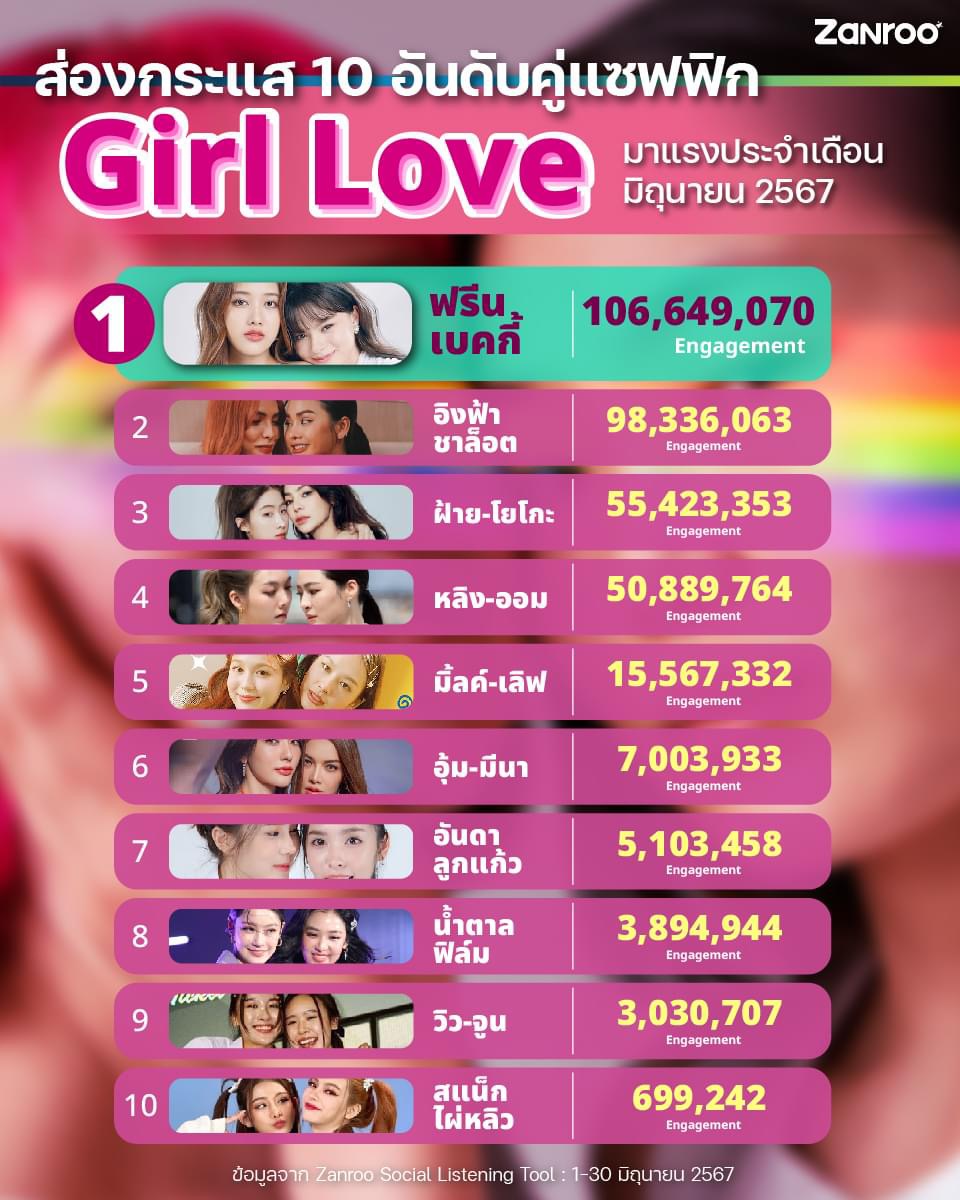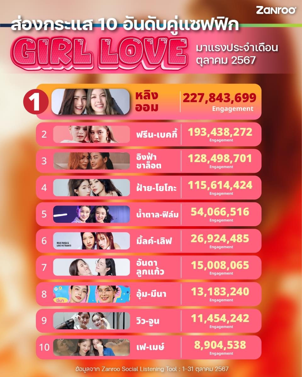 ล่าสุดด้อม “เจ้าความรัก” ยังคงยืนหยัดปล่อยพลังความรักให้ “หลิง-ออม” กันแบบไม่ยั้ง จนได้ขึ้นเป็นคู่แซฟฟิกเบอร์ 1 ที่มาแรงมากที่สุดบนโลกโซเชียล ถึง 227,843,699 Engagement โดยจัดลำดับยอดต่าง ๆ จากการมีส่วนร่วม (Engagement) เช่น ยอดการพูดถึง แสดงความคิดเห็น กดไลก์ และกดแชร์ เป็นต้น รวบรวมผ่าน Zanroo Social Listening Tool (ข้อมูลระหว่างวันที่ 1-31 ตุลาคม 2567) ซึ่งเป็นการสะท้อนให้เห็นภาพสังคมยุคใหม่ที่เปิดใจยอมรับความรักในทุกรูปแบบ จนกลายเป็นกระแสไวรัล #LingOrm ที่ทำเอาเหล่าแฟนคลับพากันไปทุกที่ที่มี หลิง-ออม และพร้อมใจร่วมติดแฮชแท็กในกิจกรรมของทั้งคู่ส่งกำลังใจจนติด