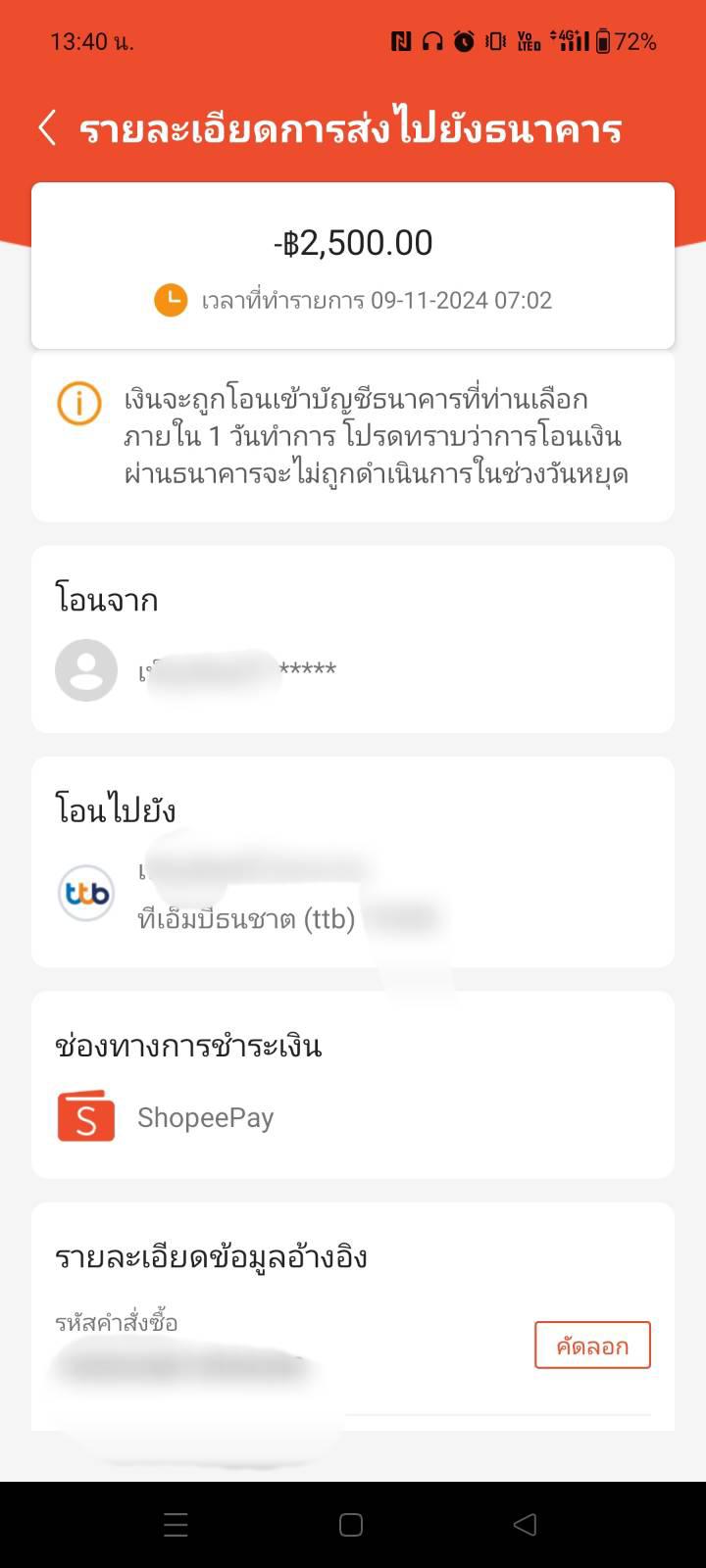 โอนเงินจากshopeepayไปธนาคารเงินไม่เข้า แต่ขึ้นว่าดำเนินการเสร็จแล้ว