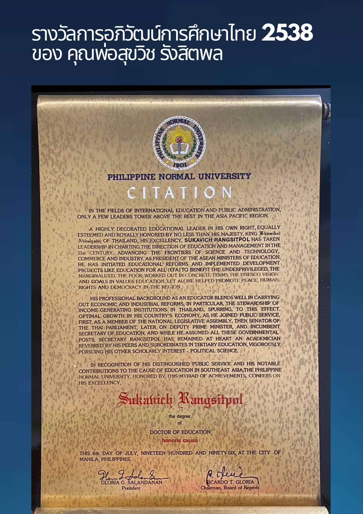 International Awards for the Thai Educational Revolution (1995 Reform) 1996 – Honorary Doctorate in Education The Philippine Normal University conferred an Honorary Doctorate in Education upon P