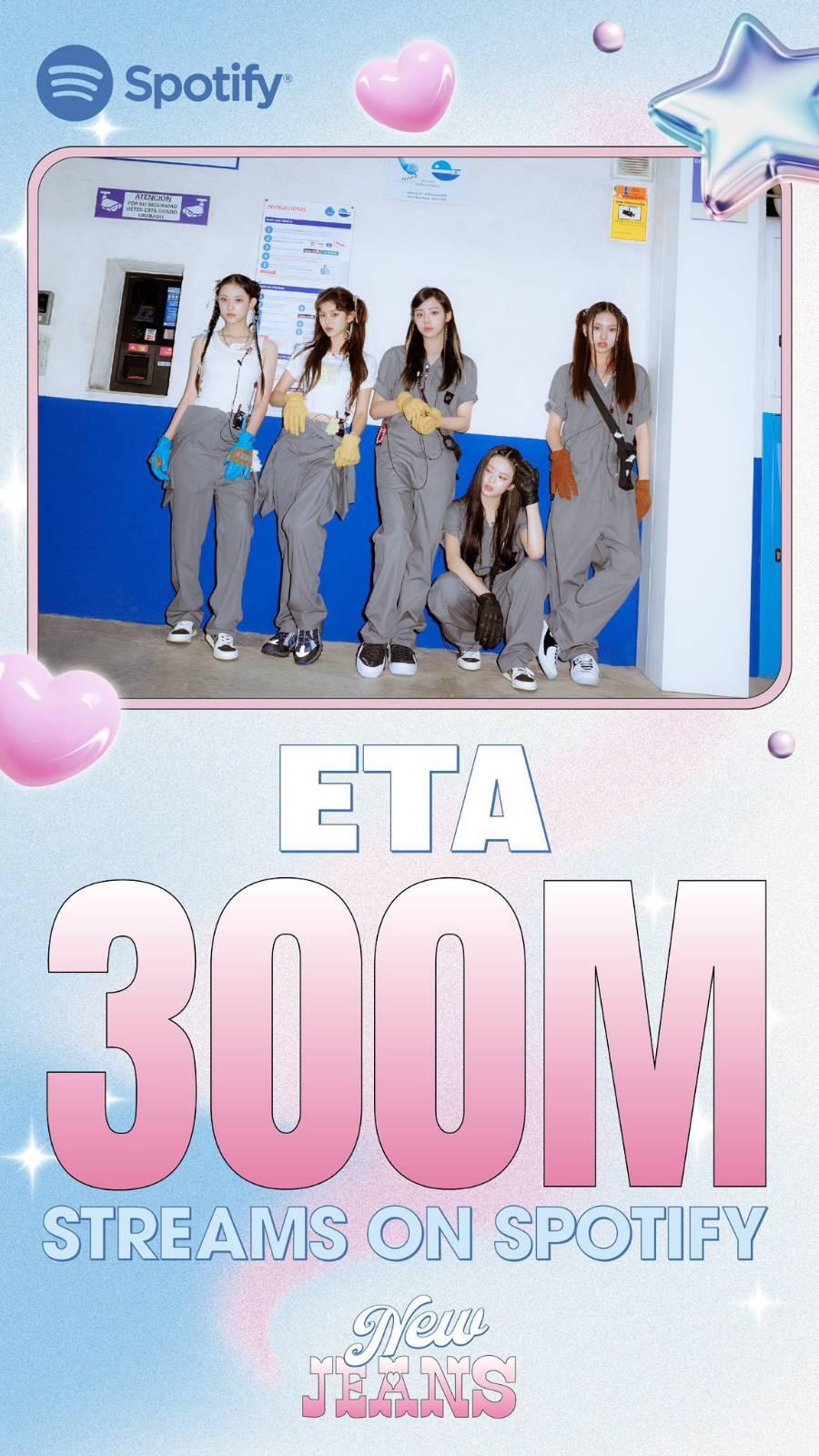 ในวันเดียวกันนั้น เพลง “ETA” หนึ่งในสามเพลงไตเติ้ลจากอัลบั้ม EP ชุดที่ 2 “Get Up” ของ NewJeans มียอดสตรีมทะลุ 300 ล้านครั้งบน Spotify ทำให้ "ETA" เป็นเพลงที่ 7 ของ NewJeans ที่มียอดสตรีมทะลุ 300 ล้านครั้ง