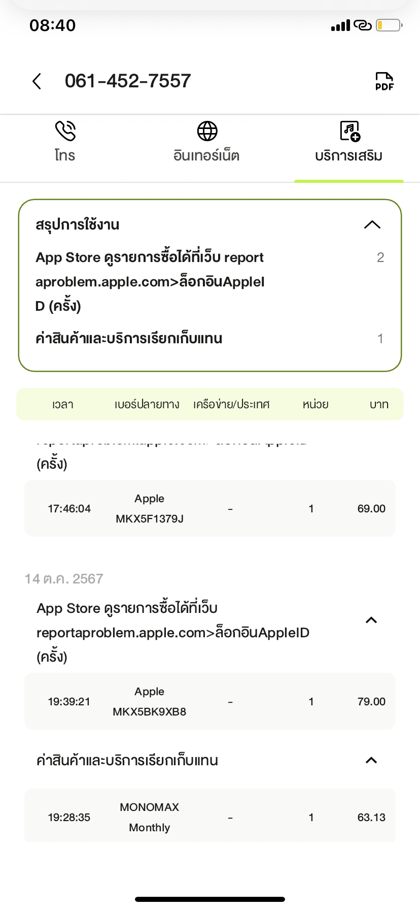 โดน ค่า internet และบริการเสริม ส่วนเกินโปรโมชั่น 744 บาท ทั้งที่ปกติจ่ายรายเดือนแระมาณ 500-600 บาท แต่รอบนี้ ยอดบิลเดือน ก.พ. รวมแล้ว1200+ เน็ตไม่จำกัด โทรก็ไม