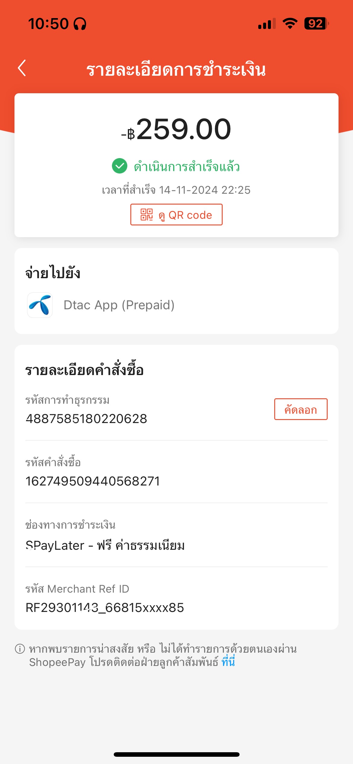 สอบถามทาง Shopee Pay บอกว่ารายการสำเร็จแล้วให้ถามทางเครือข่าย Dtac